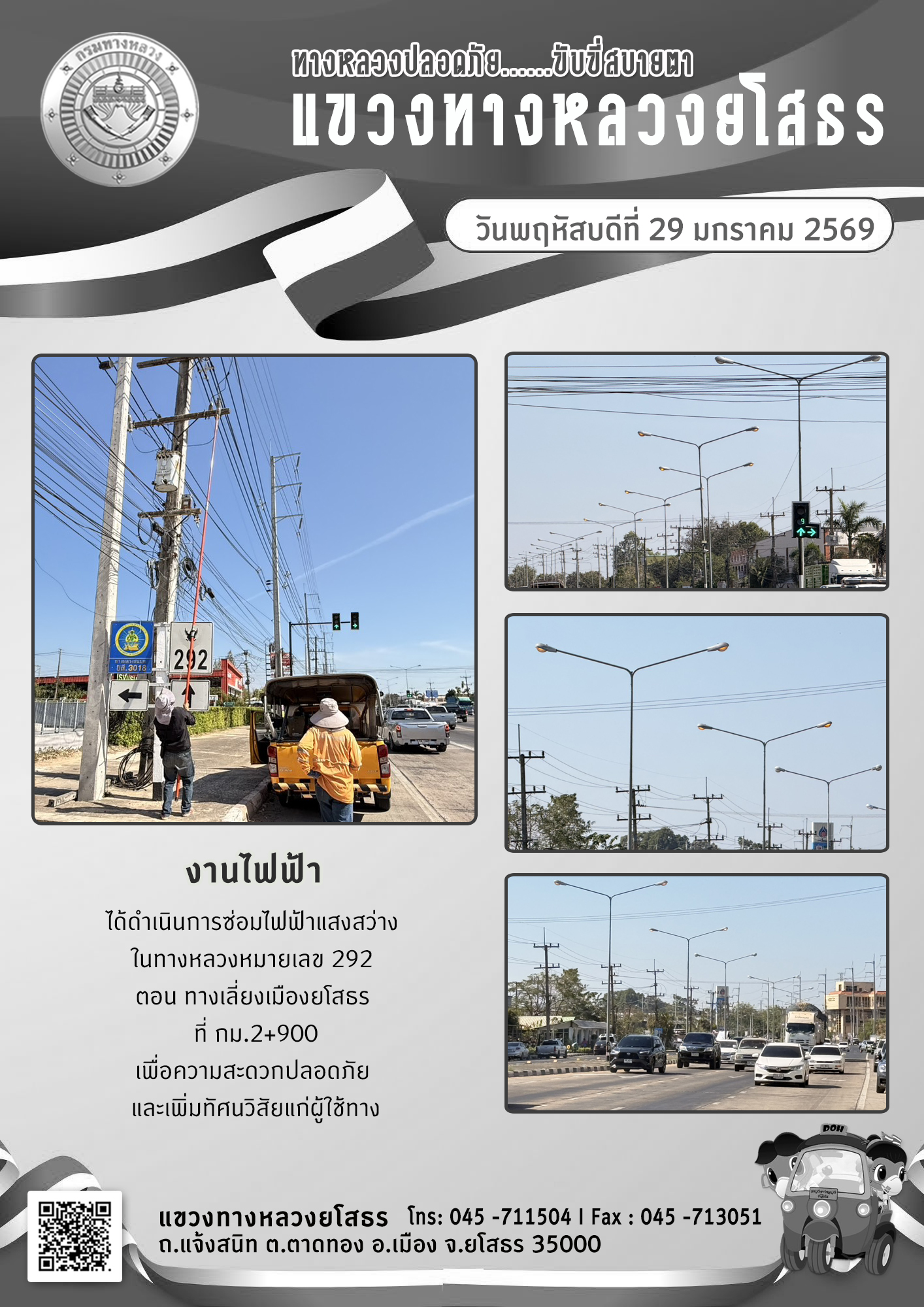 วันพฤหัสบดีที่ 29 มกราคม 2569 งานไฟฟ้า ได้ดำเนินการซ่อมไฟฟ้าแสงสว่าง ในทางหลวงหมายเลข 292 ตอน ทางเลี่ยงเมืองยโสธร ที่ กม.2+900 เพื่อความสะดวกปลอดภัย และเพิ่มทัศนวิสัยแก่ผู้ใช้ทาง