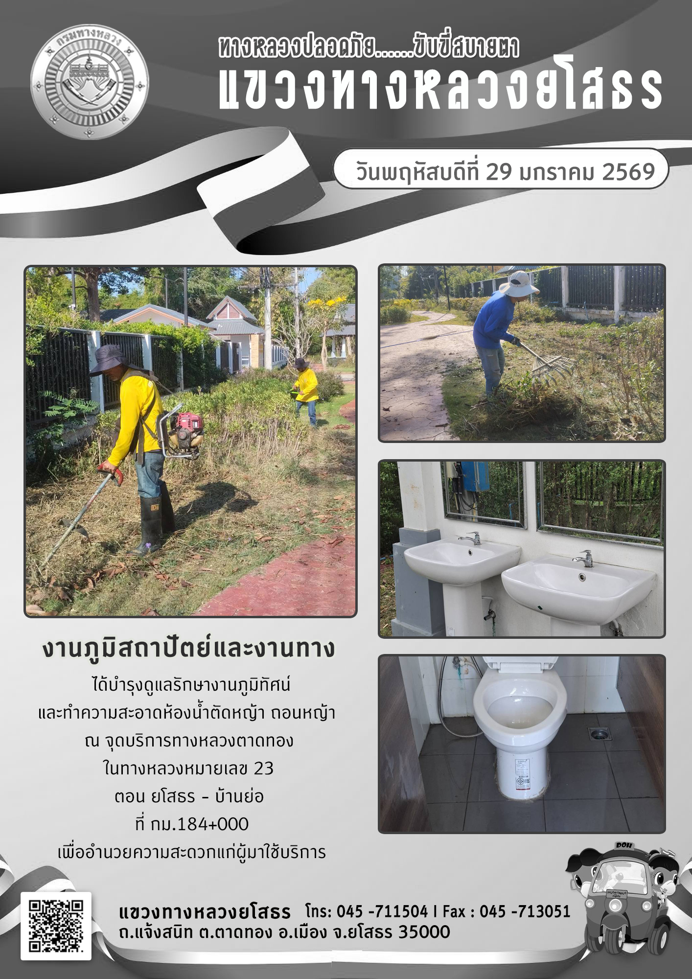 วันพฤหัสบดีที่ 29 มกราคม 2569 งานภูมิสถาปัตย์และงานทาง ได้บำรุงดูแลรักษางานภูมิทัศน์ และทำความสะอาดห้องน้ำตัดหญ้า ถอนหญ้า ณ จุดบริการทางหลวงตาดทอง ในทางหลวงหมายเลข 23 ตอน ยโสธร - บ้านย่อ ที่ กม.184+000 เพื่ออำนวยความสะดวกแก่ผู้มาใช้บริการ
