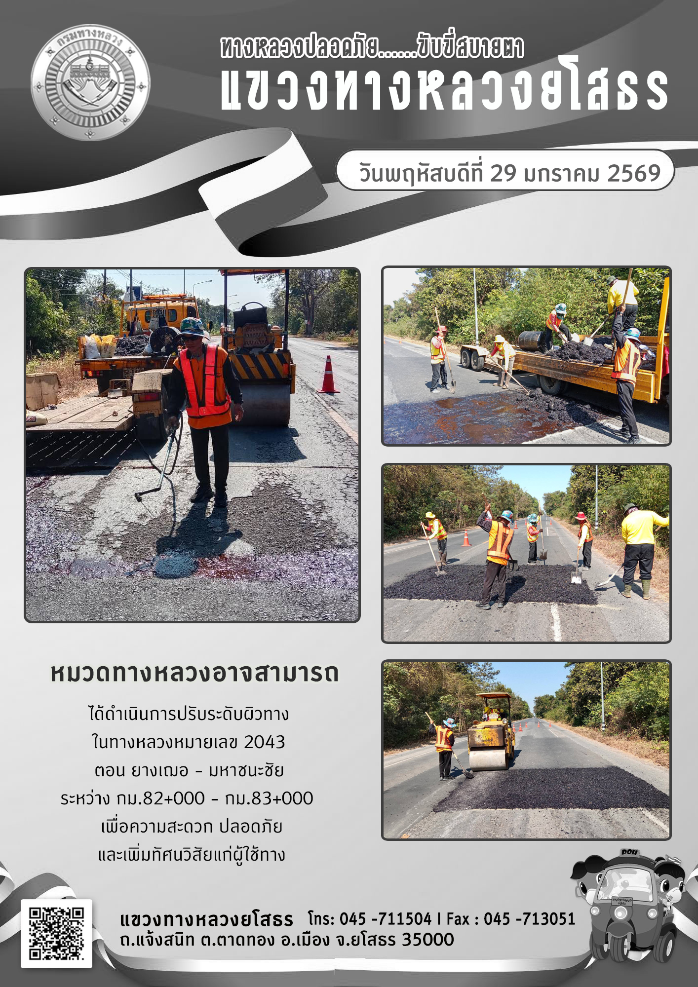 วันพฤหัสบดีที่ 29 มกราคม 2569 หมวดทางหลวงอาจสามารถ ได้ดำเนินการปรับระดับผิวทาง ในทางหลวงหมายเลข 2043 ตอน ยางเฌอ - มหาชนะชัย ระหว่าง กม.82+000 - กม.83+000 เพื่อความสะดวก ปลอดภัย และเพิ่มทัศนวิสัยแก่ผู้ใช้ทาง