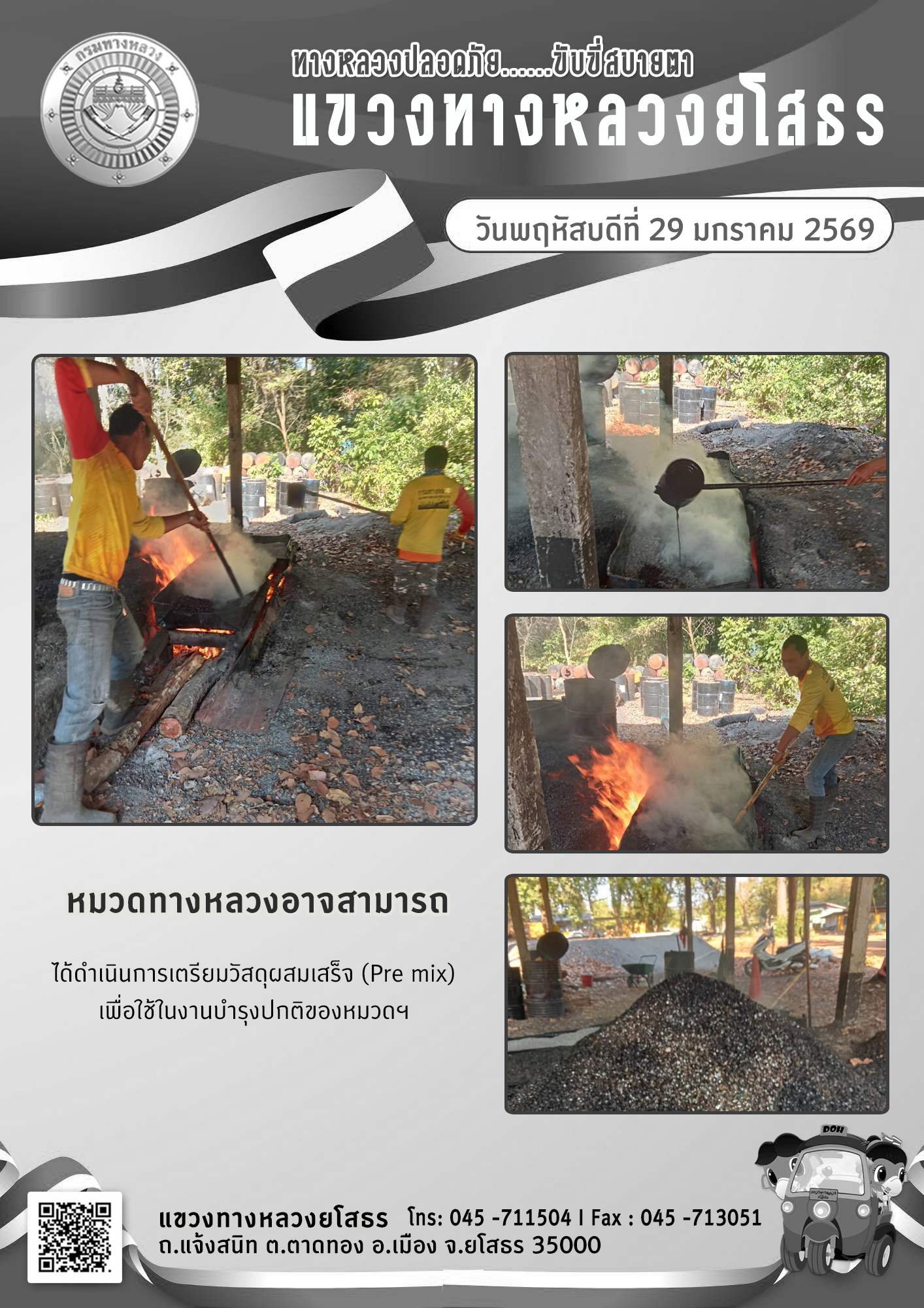 วันพฤหัสบดีที่ 29 มกราคม 2569 หมวดทางหลวงอาจสามารถ ได้ดำเนินการเตรียมวัสดุผสมเสร็จ (Pre mix) เพื่อใช้ในงานบำรุงปกติของหมวดฯ