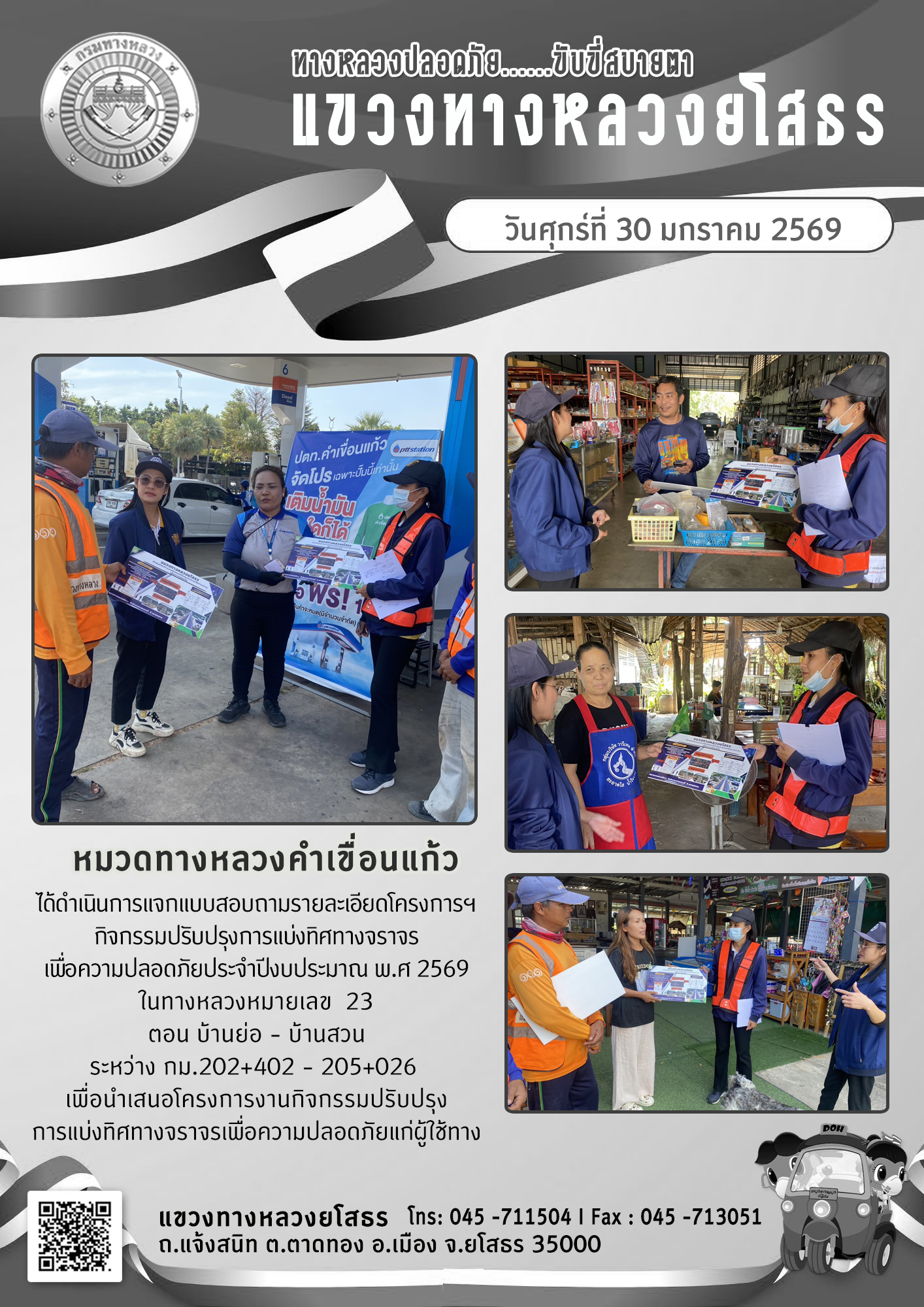 วันศุกร์ที่ 30 มกราคม 2569 หมวดทางหลวงคำเขื่อนแก้ว ได้ดำเนินการแจกแบบสอบถามรายละเอียดโครงการฯ กิจกรรมปรับปรุงการแบ่งทิศทางจราจร เพื่อความปลอดภัยประจำปีงบประมาณ พ.ศ 2569 ในทางหลวงหมายเลข 23 ตอน บ้านย่อ - บ้านสวน ระหว่าง กม.202+402 - กม.205+026 เพื่อนำ
