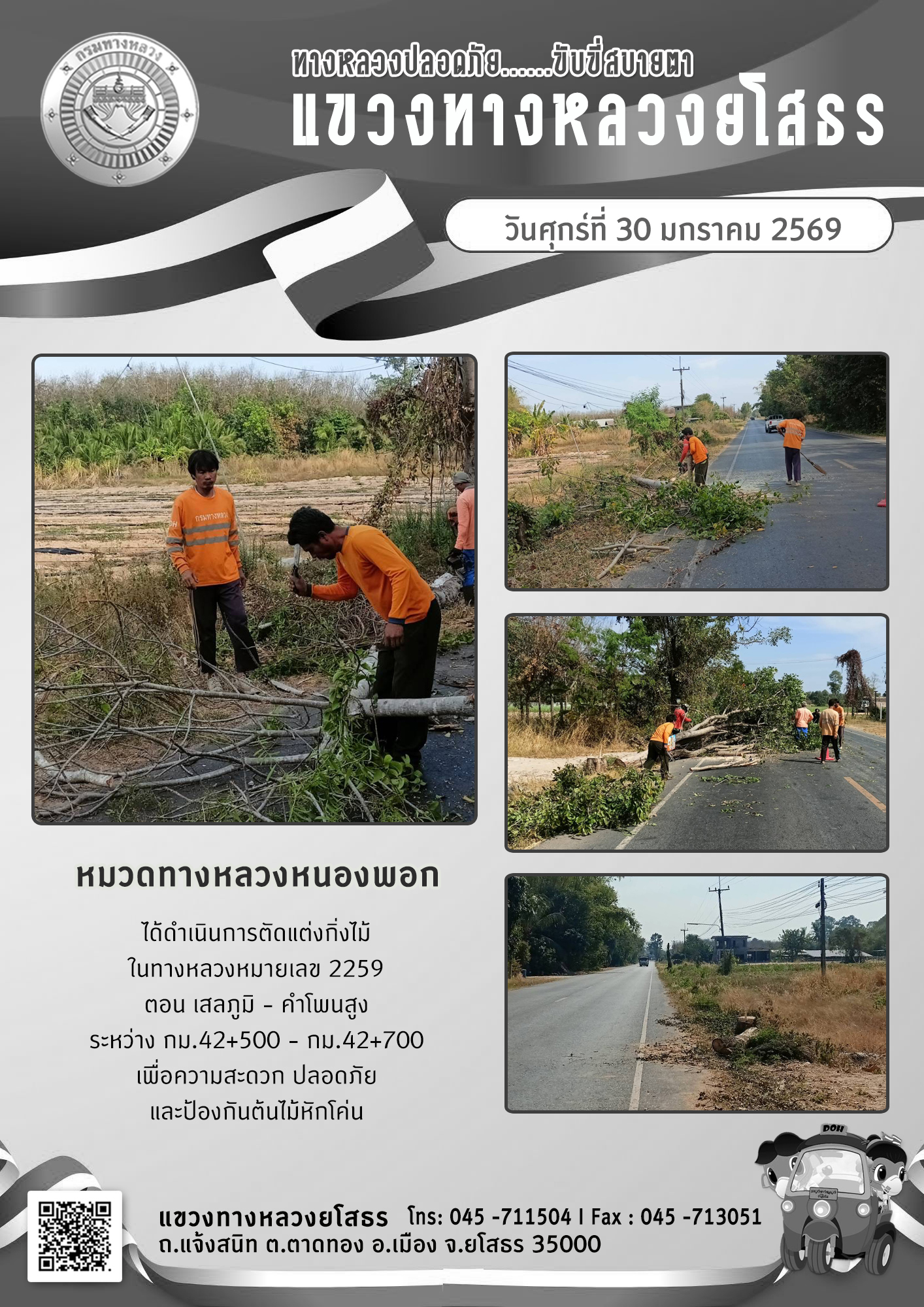 วันศุกร์ที่ 30 มกราคม 2569 หมวดทางหลวงหนองพอก ได้ดำเนินการตัดแต่งกิ่งไม้ ในทางหลวงหมายเลข 2259 ตอน เสลภูมิ - คำโพนสูง ระหว่าง กม.42+500 - กม.42+700 เพื่อความสะดวก ปลอดภัย และป้องกันต้นไม้หักโค่น