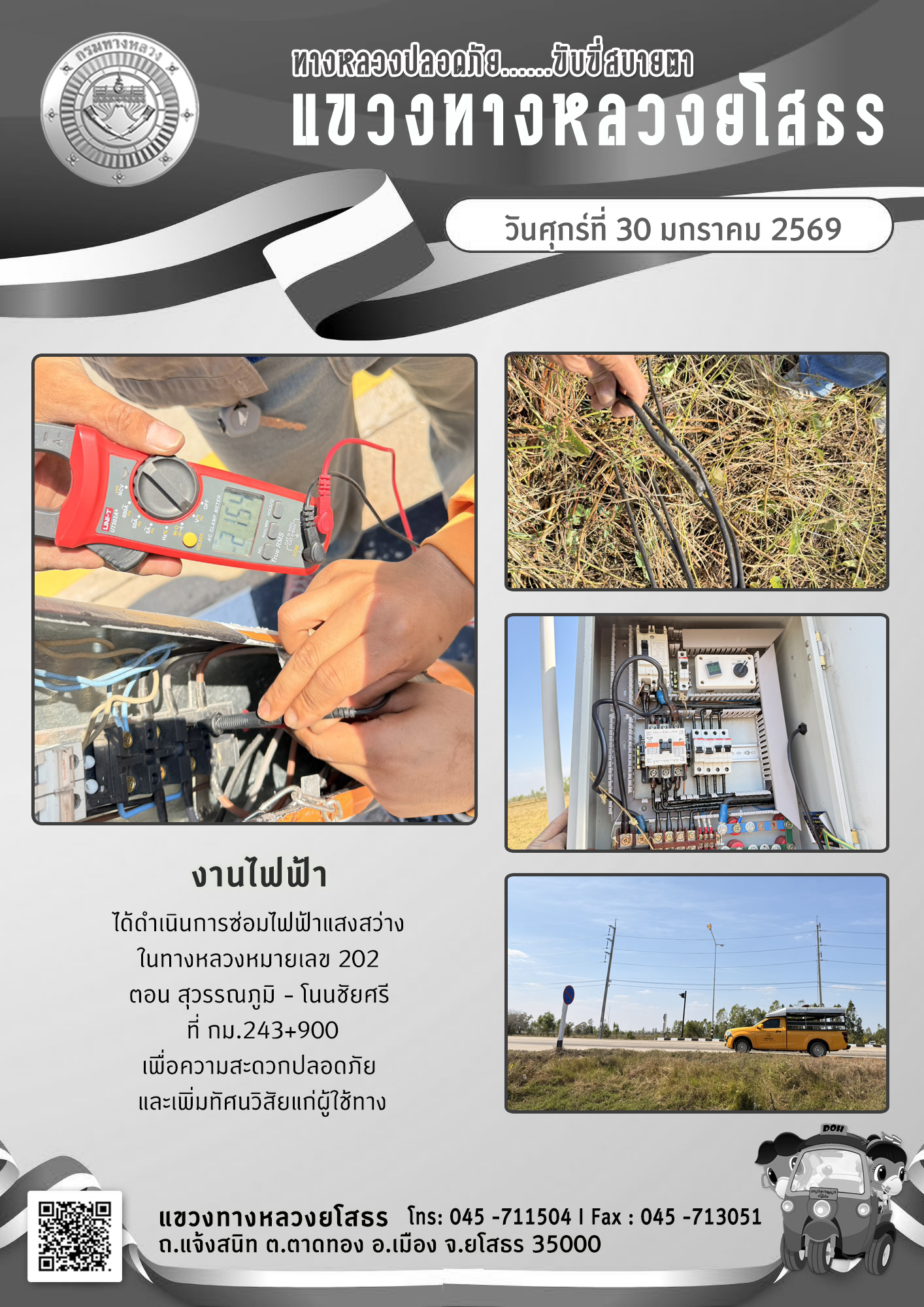 วันศุกร์ที่ 30 มกราคม 2569 งานไฟฟ้า ได้ดำเนินการซ่อมไฟฟ้าแสงสว่าง ในทางหลวงหมายเลข 202 ตอน สุวรรณภูมิ - โนนชัยศรี ที่ กม.243+900 เพื่อความสะดวกปลอดภัย และเพิ่มทัศนวิสัยแก่ผู้ใช้ทาง