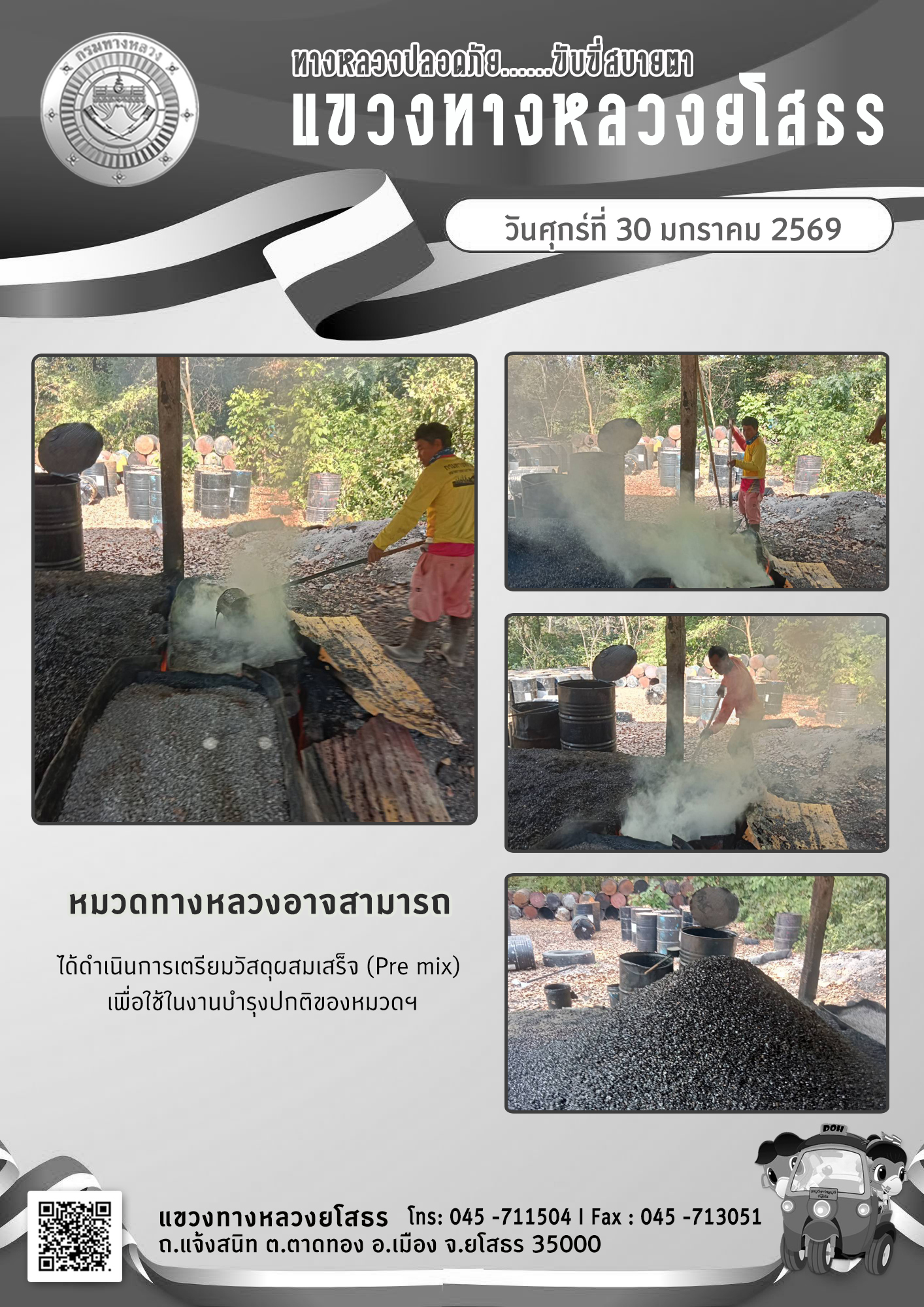 วันศุกร์ที่ 30 มกราคม 2569 หมวดทางหลวงอาจสามารถ ได้ดำเนินการเตรียมวัสดุผสมเสร็จ (Pre mix) เพื่อใช้ในงานบำรุงปกติของหมวดฯ