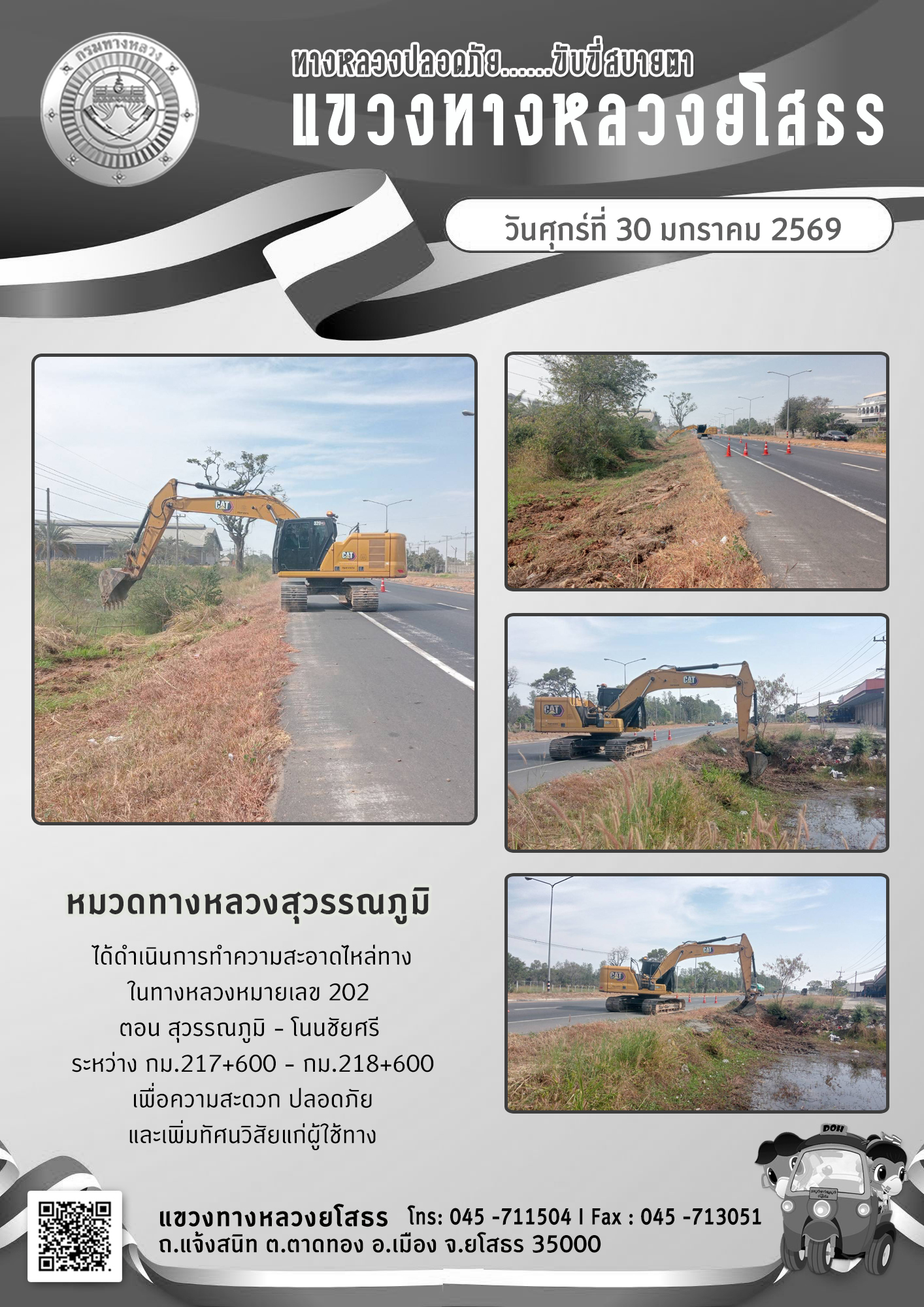 วันศุกร์ที่ 30 มกราคม 2569 หมวดทางหลวงสุวรรณภูมิ ได้ดำเนินการทำความสะอาดไหล่ทาง ในทางหลวงหมายเลข 202 ตอน สุวรรณภูมิ - โนนชัยศรี ระหว่าง กม.217+600 - กม.218+600 เพื่อความสะดวก ปลอดภัย และเพิ่มทัศนวิสัยแก่ผู้ใช้ทาง