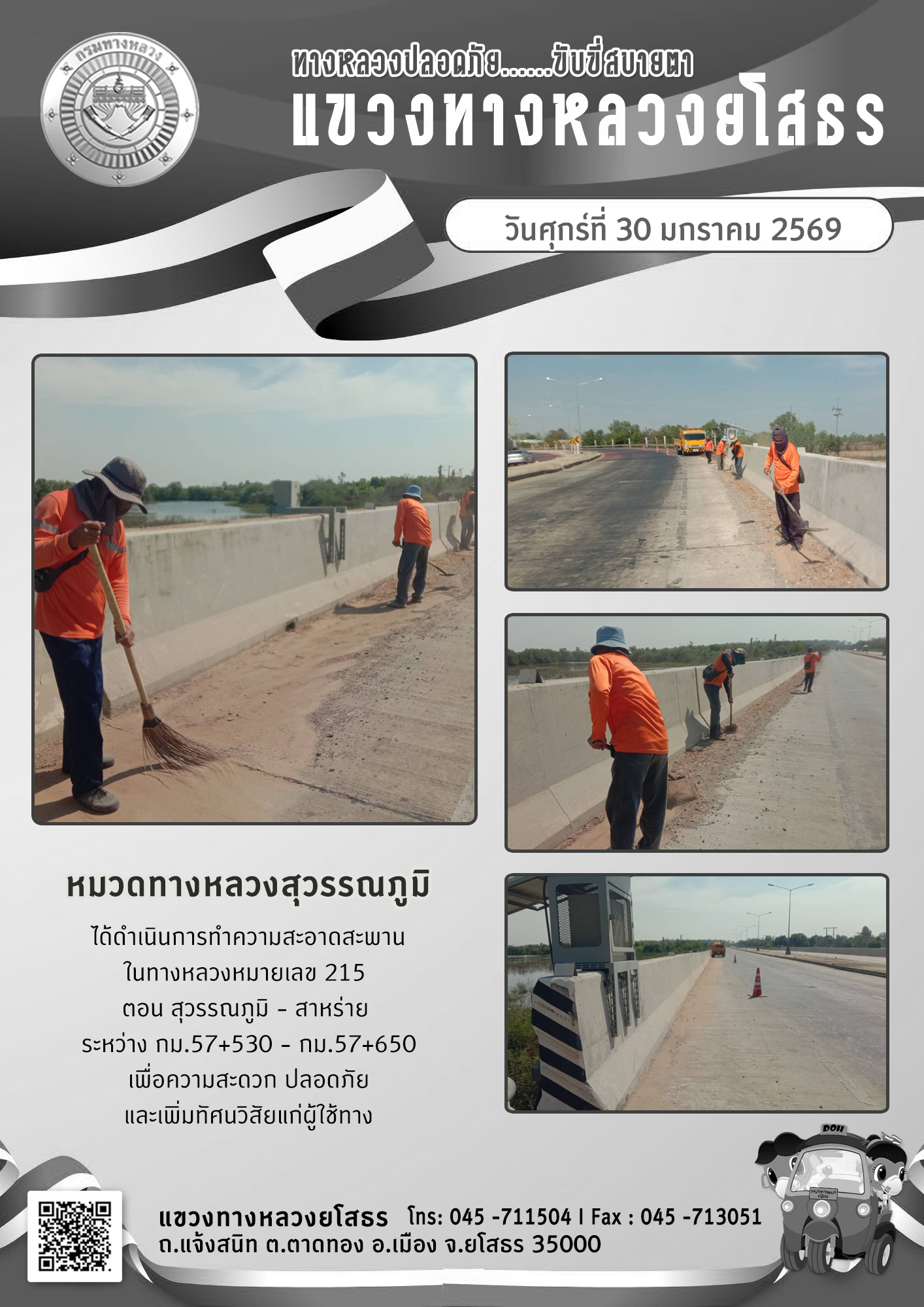 วันศุกร์ที่ 30 มกราคม 2569 หมวดทางหลวงสุวรรณภูมิ ได้ดำเนินการทำความสะอาดสะพาน ในทางหลวงหมายเลข 215 ตอน สุวรรณภูมิ - สาหร่าย ระหว่าง กม.57+530 - กม.57+650 เพื่อความสะดวก ปลอดภัย และเพิ่มทัศนวิสัยแก่ผู้ใช้ทาง