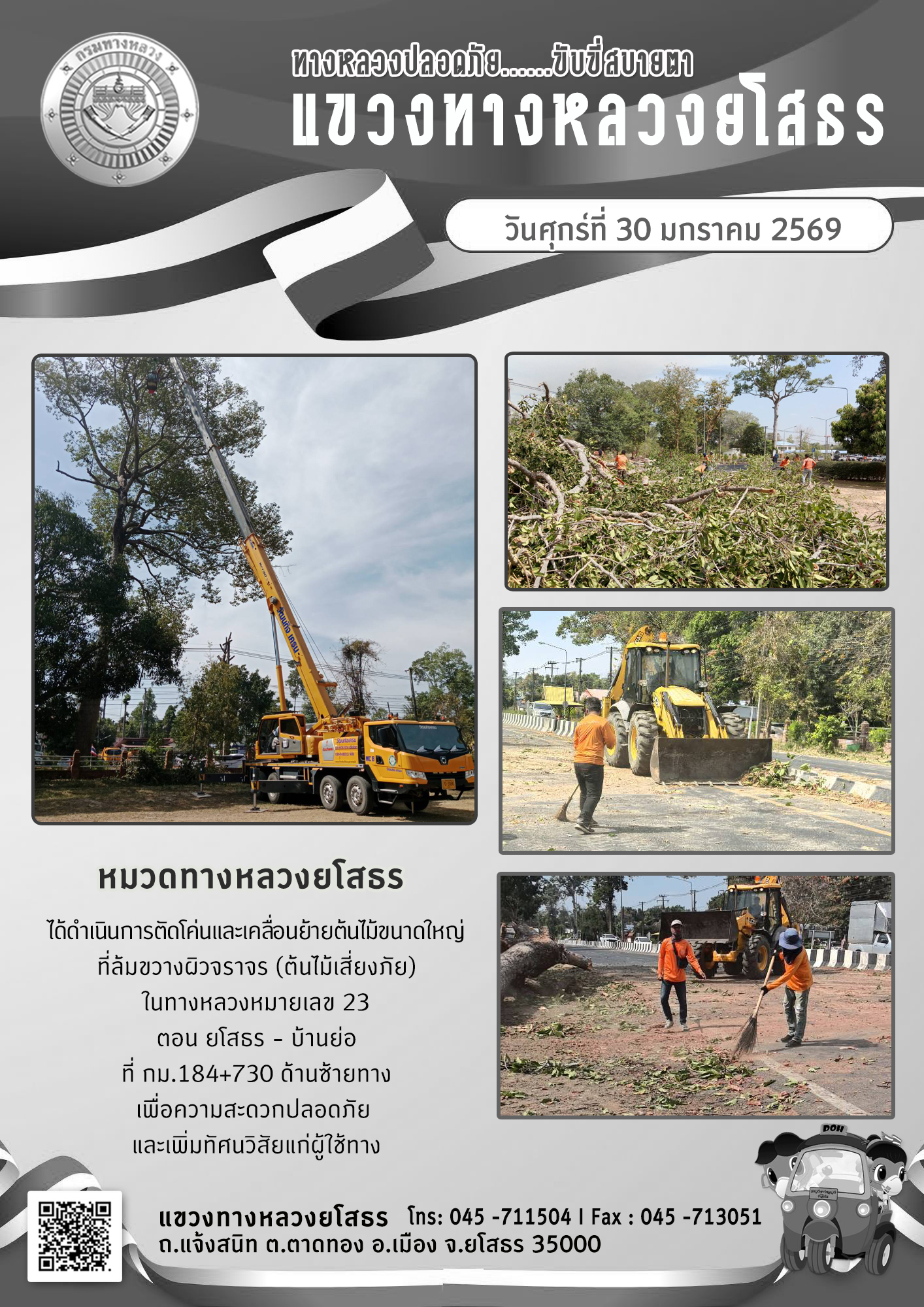 วันศุกร์ที่ 30 มกราคม 2569 หมวดทางหลวงยโสธร ได้ดำเนินการตัดโค่นและเคลื่อนย้ายต้นไม้ขนาดใหญ่ ที่ลัมขวางผิวจราจร (ตันไม้เสี่ยงภัย) ในทางหลวงหมายเลข 23 ตอน ยโสธร - บ้านย่อ ที่ กม.184+730 ด้านซ้ายทาง เพื่อความสะดวกปลอดภัย และเพิ่มทัศนวิสัยแก่ผู้ใช้ทาง