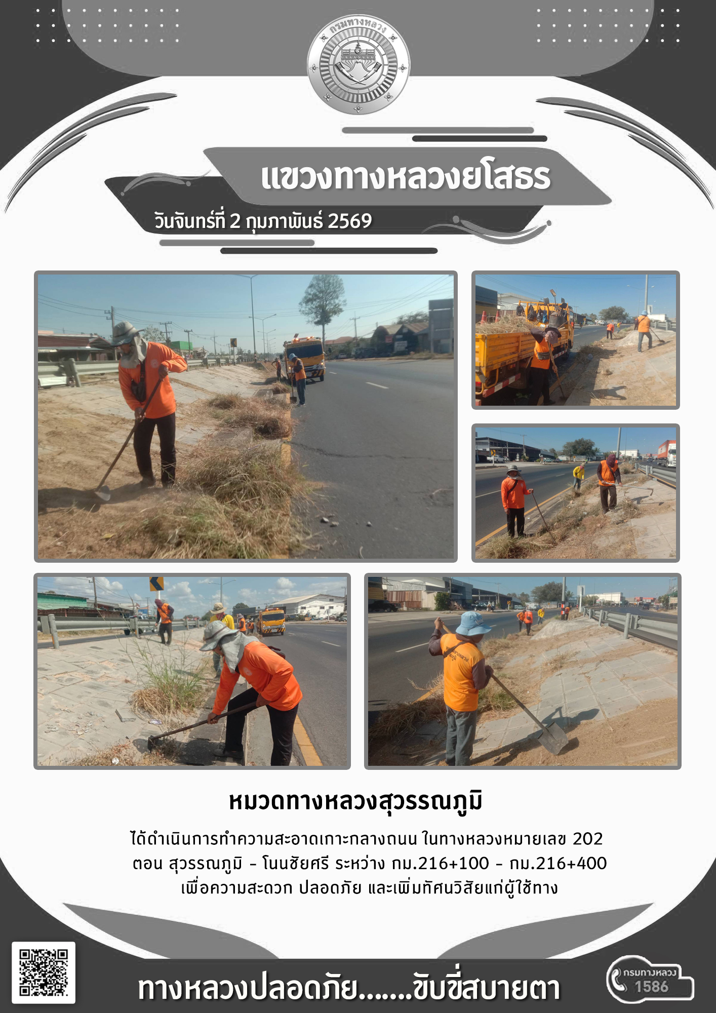 วันจันทร์ที่ 2 กุมภาพันธ์ 2569 หมวดทางหลวงสุวรรณภูมิ ได้ดำเนินการทำความสะอาดเกาะกลางถนน ในทางหลวงหมายเลข 202 ตอน สุวรรณภูมิ - โนนชัยศรี ระหว่าง กม.216+100 - กม.216+400 เพื่อความสะดวก ปลอดภัย และเพิ่มทัศนวิสัยแก่ผู้ใช้ทาง