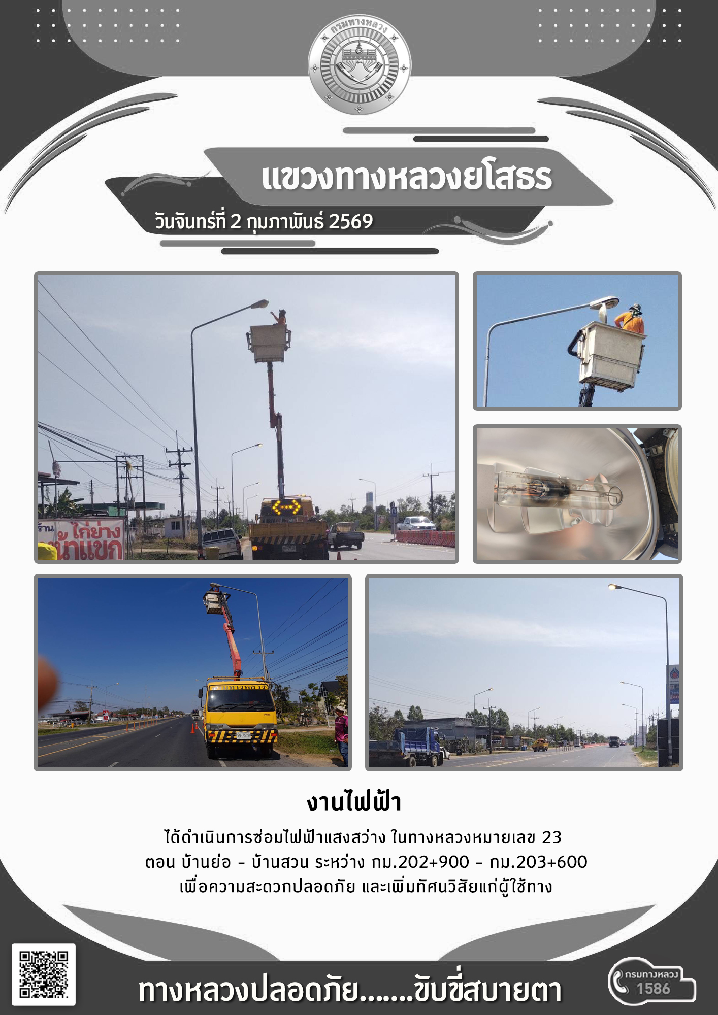 วันจันทร์ที่ 2 กุมภาพันธ์ 2569 งานไฟฟ้า ได้ดำเนินการซ่อมไฟฟ้าแสงสว่าง ในทางหลวงหมายเลข 23 ตอน บ้านย่อ - บ้านสวน ระหว่าง กม.202+900 - กม.203+600 เพื่อความสะดวกปลอดภัย และเพิ่มทัศนวิสัยแก่ผู้ใช้ทาง