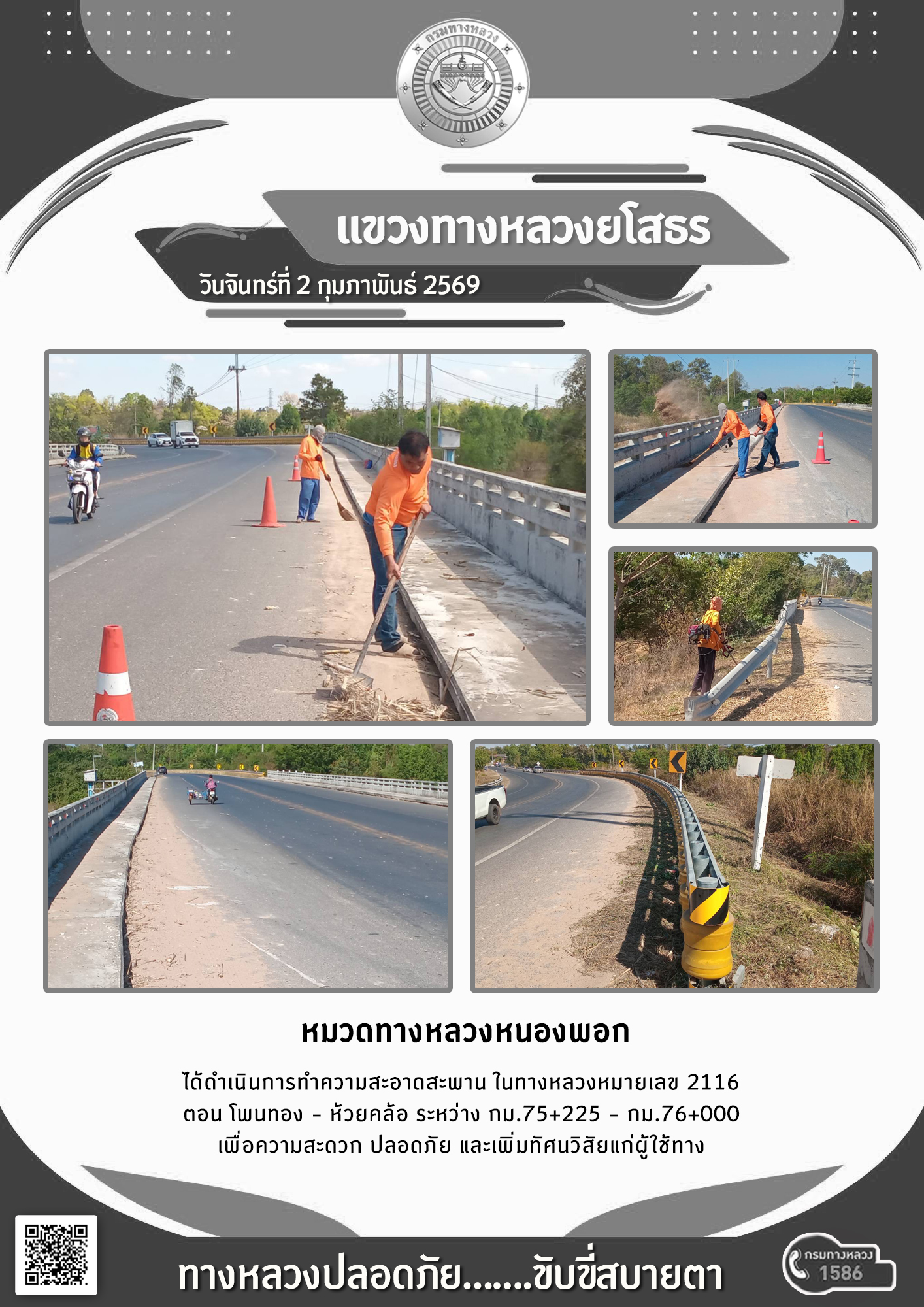 วันจันทร์ที่ 2 กุมภาพันธ์ 2569 หมวดทางหลวงหนองพอก ได้ดำเนินการทำความสะอาดสะพาน ในทางหลวงหมายเลข 2116 ตอน โพนทอง - หัวยคล้อ ระหว่าง กม.75+225 - กม.76+000 เพื่อความสะดวก ปลอดภัย และเพิ่มทัศนวิสัยแก่ผู้ใช้ทาง