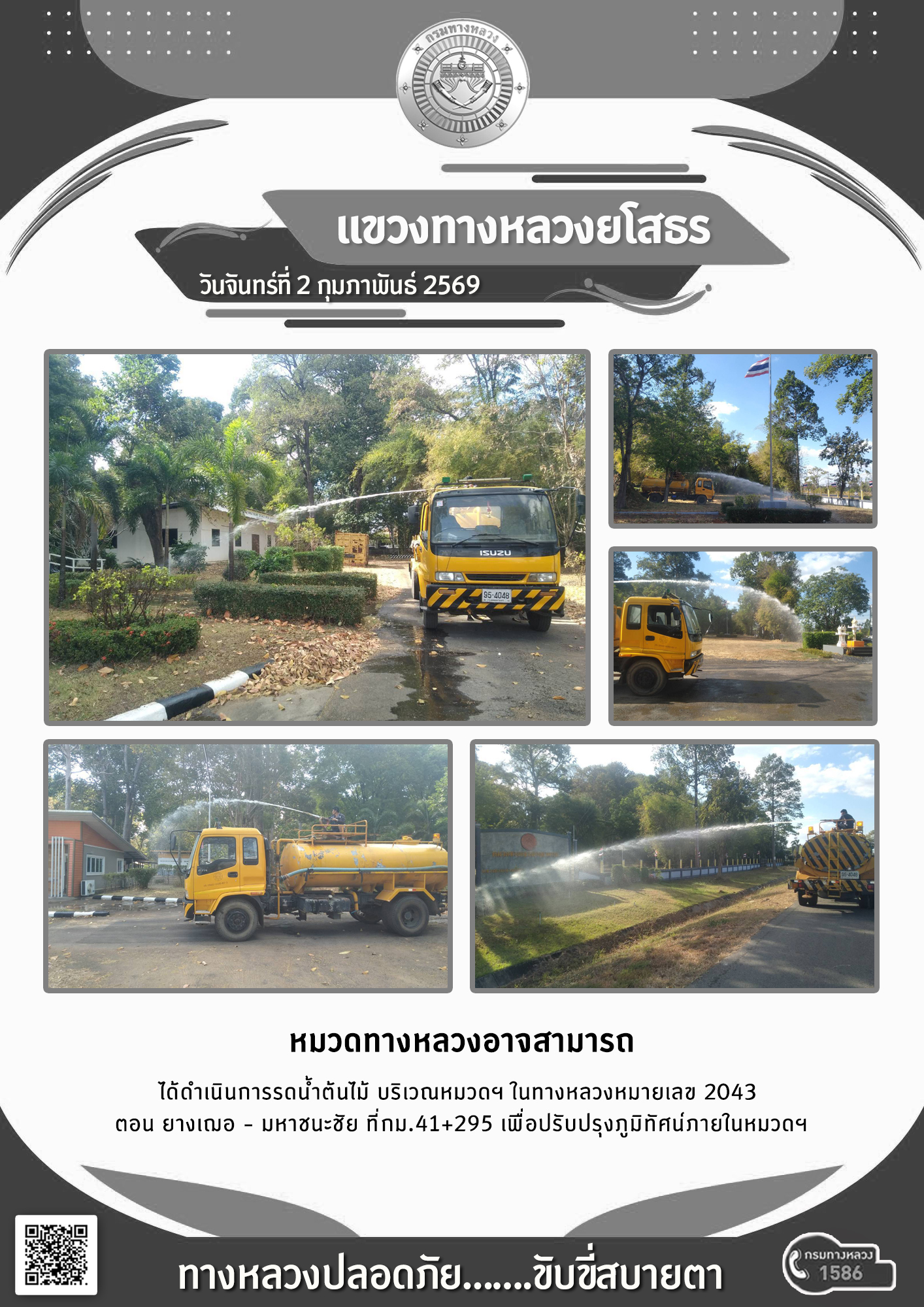 วันจันทร์ที่ 2 กุมภาพันธ์ 2569 หมวดทางหลวงอาจสามารถ ได้ดำเนินการรดน้ำตันไม้ บริเวณหมวดฯ ในทางหลวงหมายเลข 2043 ตอน ยางเฌอ - มหาชนะชัย ที่ กม.41+295 เพื่อปรับปรุงภูมิทัศน์ภายในหมวดฯ