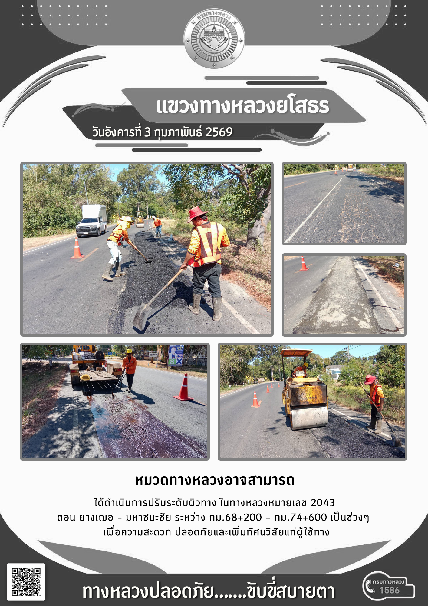 วันอังคารที่ 3 กุมภาพันธ์ 2569 หมวดทางหลวงอาจสามารถ ได้ดำเนินการปรับระดับผิวทาง ในทางหลวงหมายเลข 2043 ตอน ยางเฌอ - มหาชนะชัย ระหว่าง กม.68+200 - กม.74+600 เป็นช่วงๆ เพื่อความสะดวก ปลอดภัยและเพิ่มทัศนวิสัยแก่ผู้ใช้ทาง