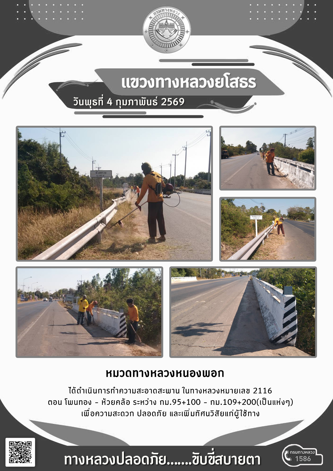 วันพุธที่ 4 กุมภาพันธ์ 2569 หมวดทางหลวงหนองพอก ได้ดำเนินการทำความสะอาดสะพาน ในทางหลวงหมายเลข 2116 ตอน โพนทอง - ห้วยคล้อ ระหว่าง กม.95+100 - กม.109+200(เป็นแห่งๆ) เพื่อความสะดวก ปลอดภัย และเพิ่มทัศนวิสัยแก่ผู้ใช้ทาง