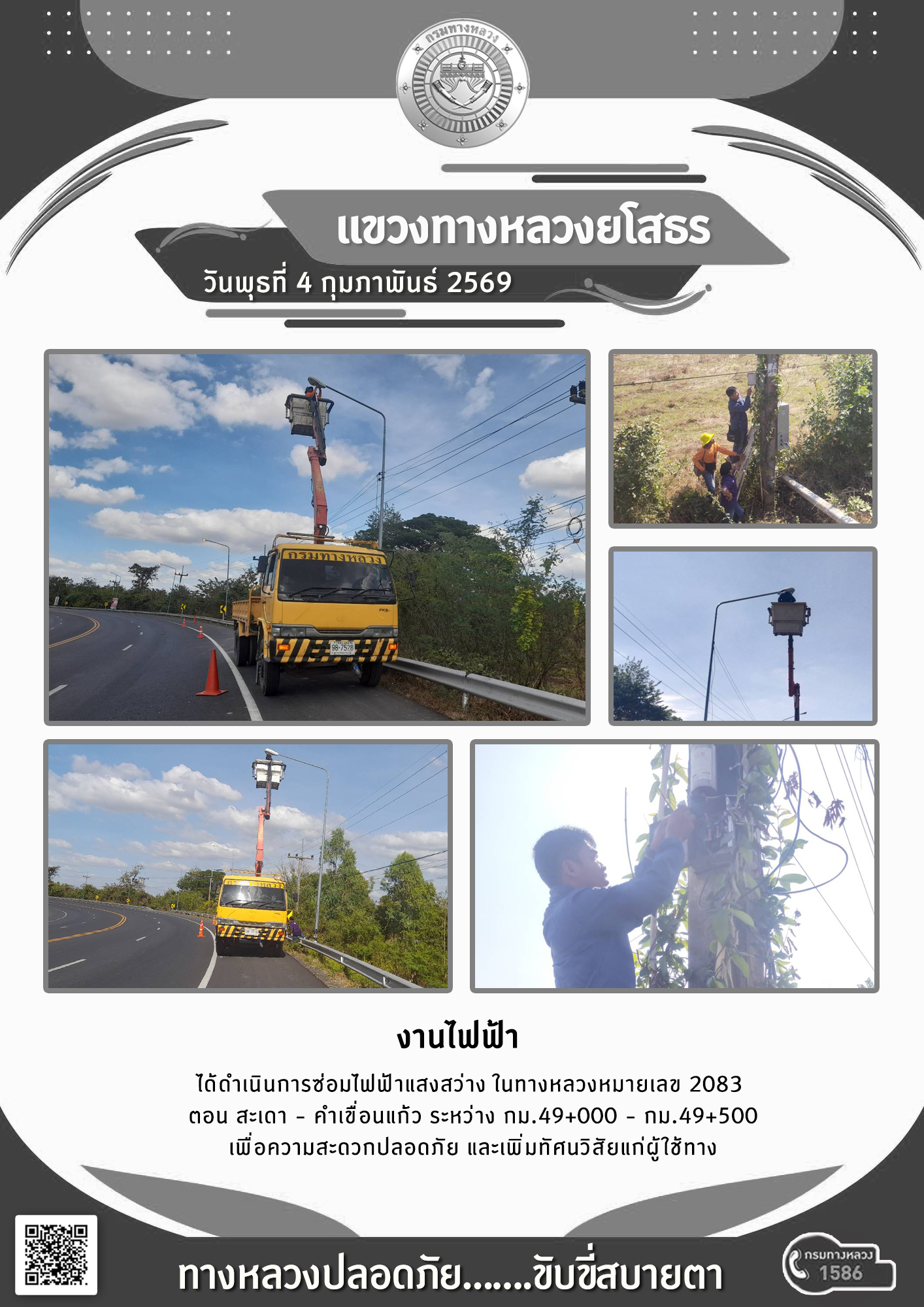 วันพุธที่ 4 กุมภาพันธ์ 2569 งานไฟฟ้า ได้ดำเนินการซ่อมไฟฟ้าแสงสว่าง ในทางหลวงหมายเลข 2083 ตอน สะเดา - คำเขื่อนแก้ว ระหว่าง กม.49+000 - กม.49+500 เพื่อความสะดวกปลอดภัย และเพิ่มทัศนวิสัยแก่ผู้ใช้ทาง