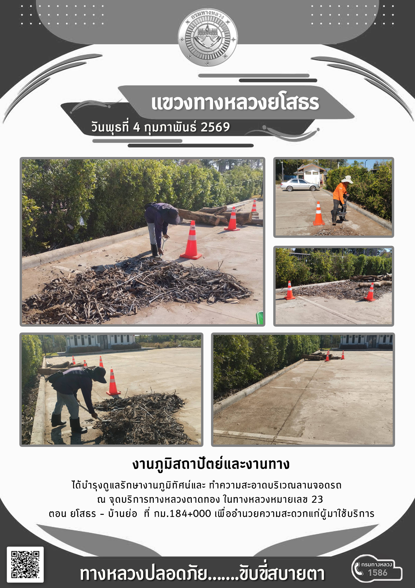 วันพุธที่ 4 กุมภาพันธ์ 2569 งานภูมิสถาปัตย์และงานทาง ได้บำรุงดูแลรักษางานภูมิทัศน์และทำความสะอาดบริเวณลานจอดรถ ณ จุดบริการทางหลวงตาดทอง ในทางหลวงหมายเลข 23 ตอน ยโสธร - บ้านย่อ ที่ กม.184+000 เพื่ออำนวยความสะดวกแก่ผู้มาใช้บริการ