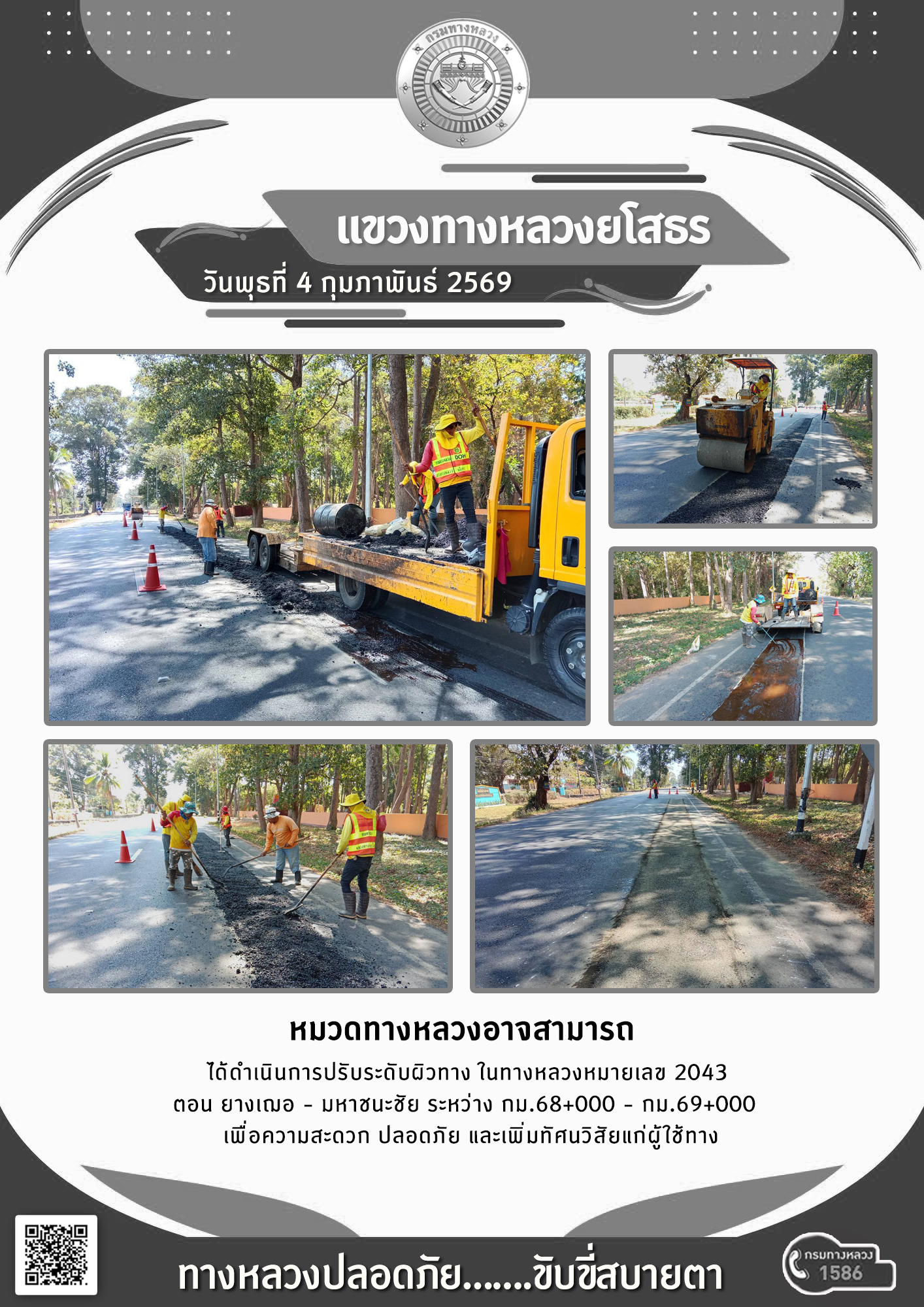 วันพุธที่ 4 กุมภาพันธ์ 2569 หมวดทางหลวงอาจสามารถ ได้ดำเนินการปรับระดับผิวทาง ในทางหลวงหมายเลข 2043 ตอน ยางเฌอ - มหาชนะชัย ระหว่าง กม.68+000 - กม.69+000 เพื่อความสะดวก ปลอดภัย และเพิ่มทัศนวิสัยแก่ผู้ใช้ทาง