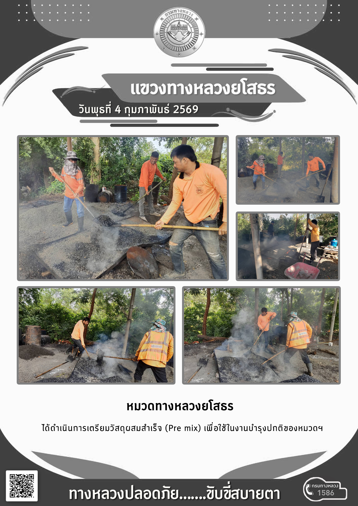 วันพุธที่ 4 กุมภาพันธ์ 2569 หมวดทางหลวงยโสธร ได้ดำเนินการเตรียมวัสดุผสมสำเร็จ (Pre mix) เพื่อใช้ในงานบำรุงปกติของหมวดฯ