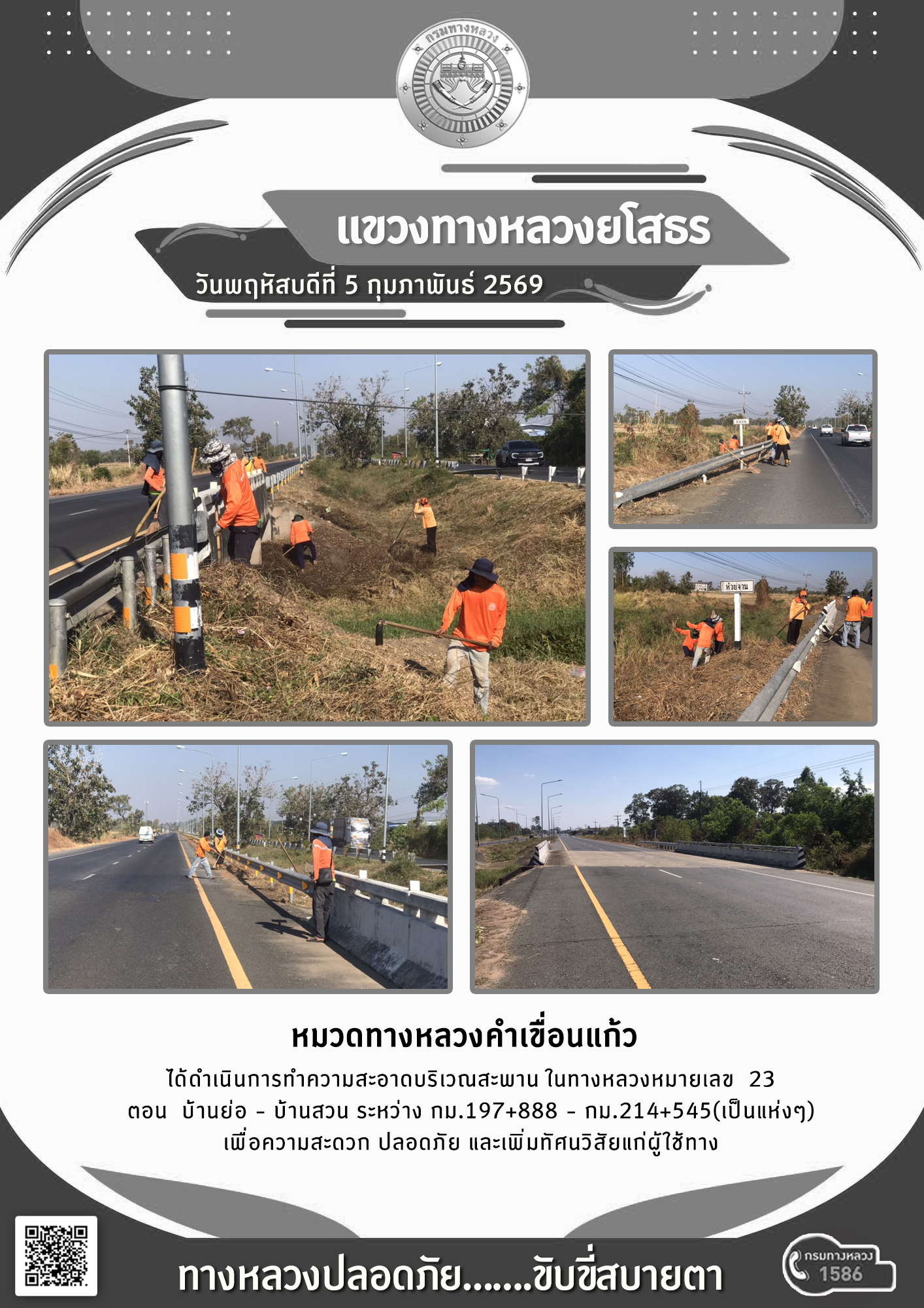 - [10:23] ทั่วไป วันอังคารที่ 31 มีนาคม 2569 ม กรมทางหลวง ๒ งหลวงยโสธร หมวดทางหลวงยโสธร ได้ดำเนินการแจ้งเดือนผู้รุกล้ำ ในทางหลวงหมายเลซ 23 ตอน ยโสธร - บ้านย่อ ที่ กม.186+665 ด้านซ้ายทาง เพื่อความสะดวกปลอดภัย และเพิ่มทัศนวิสัยแก่ผู้ใช้ทาง