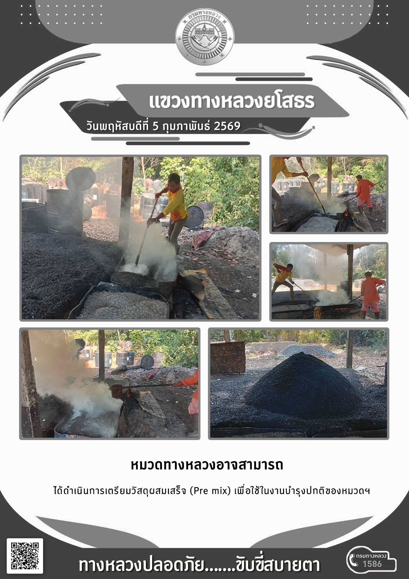 วันพฤหัสบดีที่ 5 กุมภาพันธ์ 2569 หมวดทางหลวงอาจสามารถ ได้ดำเนินการเตรียมวัสดุผสมเสร็จ (Pre mix) เพื่อใช้ในงานบำรุงปกติของหมวดฯ