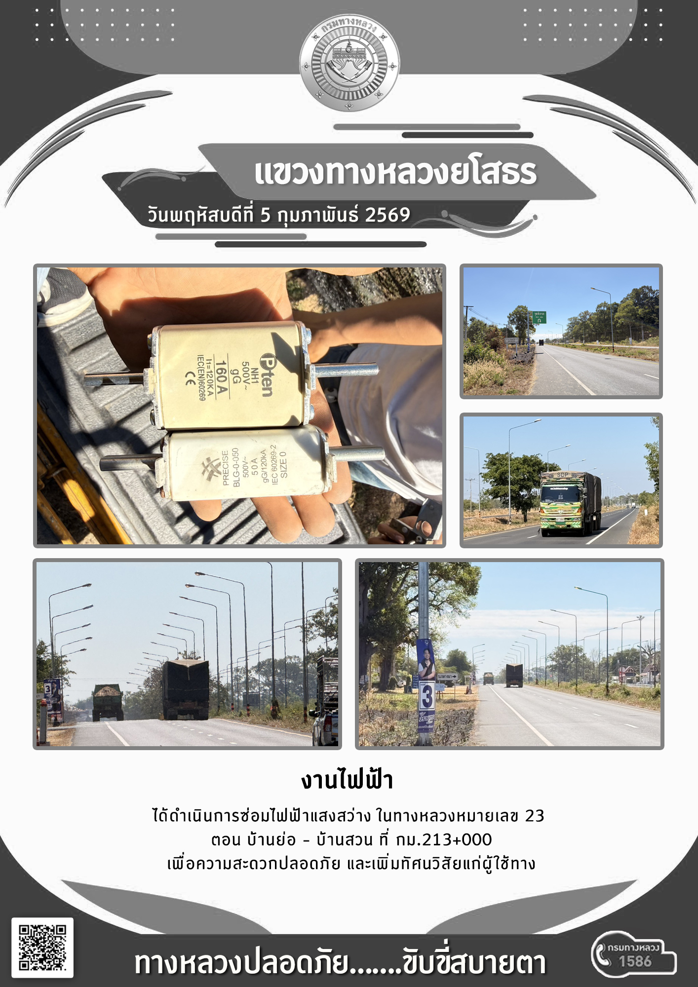 วันพฤหัสบดีที่ 5 กุมภาพันธ์ 2569 งานไฟฟ้า ได้ดำเนินการซ่อมไฟฟ้าแสงสว่าง ในทางหลวงหมายเลข 23 ตอน บ้านย่อ - บ้านสวน ที่ กม.213+000 เพื่อความสะดวกปลอดภัย และเพิ่มทัศนวิสัยแก่ผู้ใช้ทาง