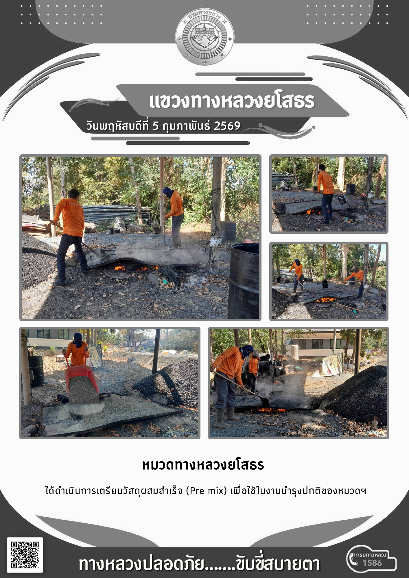 วันพฤหัสบดีที่ 5 กุมภาพันธ์ 2569 หมวดทางหลวงยโสธร ได้ดำเนินการเตรียมวัสดุผสมสำเร็จ (Pre mix) เพื่อใช้ในงานบำรุงปกติของหมวดฯ
