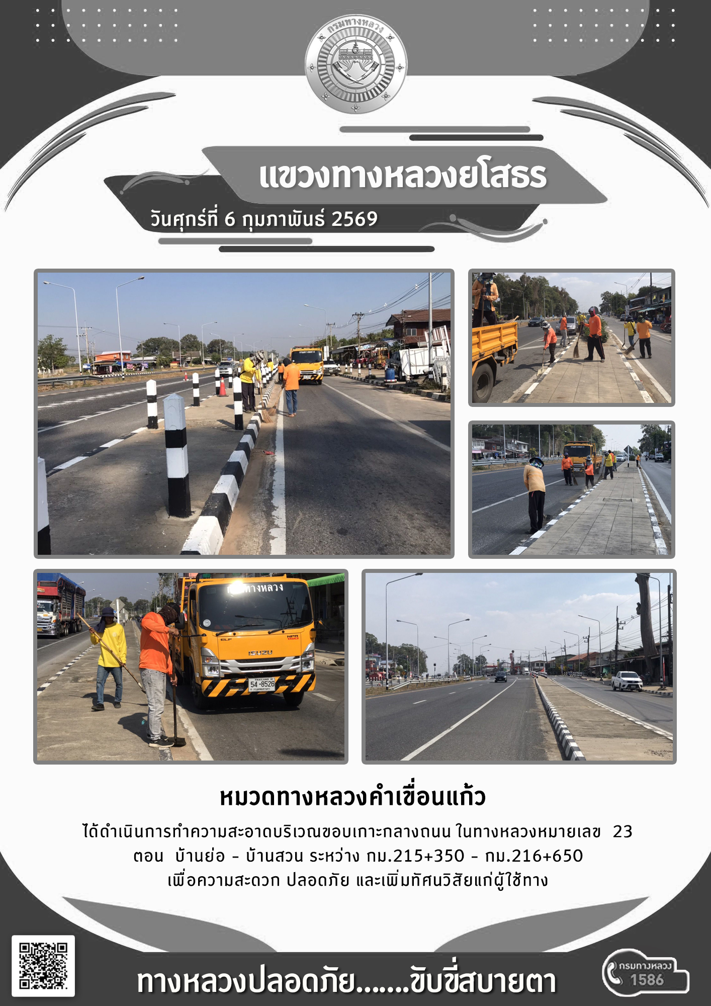 วันศุกร์ที่ 6 กุมภาพันธ์ 2569 หมวดทางหลวงคำเขื่อนแก้ว ได้ดำเนินการทำความสะอาดบริเวณขอบเกาะกลางถนน ในทางหลวงหมายเลข 23 ตอน บ้านย่อ - บ้านสวน ระหว่าง กม.215+350 - กม.216+650 เพื่อความสะดวก ปลอดภัย และเพิ่มทัศนวิสัยแก่ผู้ใช้ทาง