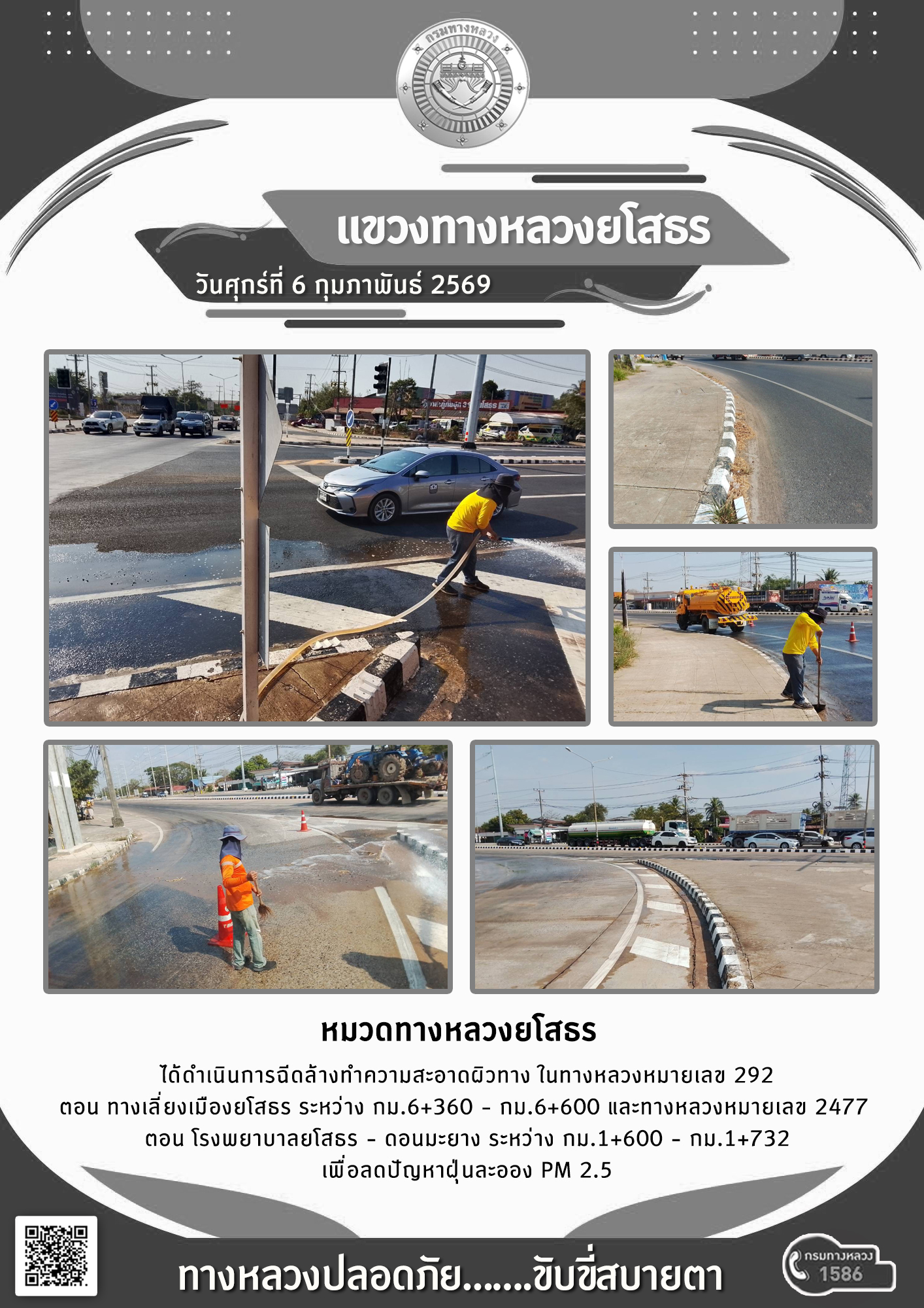 วันศุกร์ที่ 6 กุมภาพันธ์ 2569 หมวดทางหลวงยโสธร ได้ดำเนินการฉีดล้างทำความสะอาดผิวทาง ในทางหลวงหมายเลข 292 ตอน ทางเลี่ยงเมืองยโสธร ระหว่าง กม.6+360 - กม.6+600 และทางหลวงหมายเลข 2477 ตอน โรงพยาบาลยโสธร - ดอนมะยาง ระหว่าง กม.1+600 - กม.1+732 เพื่อลดปัญหา
