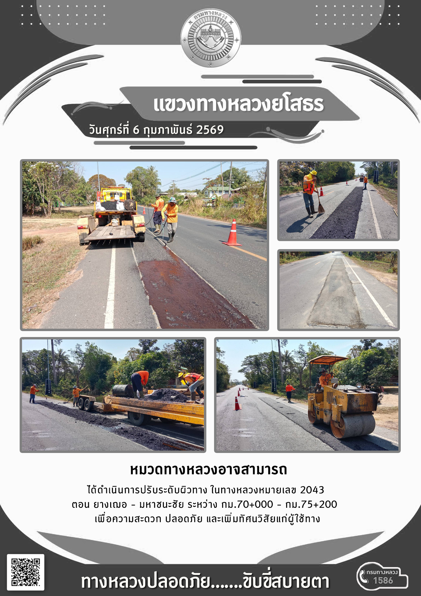 วันศุกร์ที่ 6 กุมภาพันธ์ 2569 หมวดทางหลวงอาจสามารถ ได้ดำเนินการปรับระดับผิวทาง ในทางหลวงหมายเลข 2043 ตอน ยางเฌอ - มหาชนะชัย ระหว่าง กม.70+000 - กม.75+200 เพื่อความสะดวก ปลอดภัย และเพิ่มทัศนวิสัยแก่ผู้ใช้ทาง