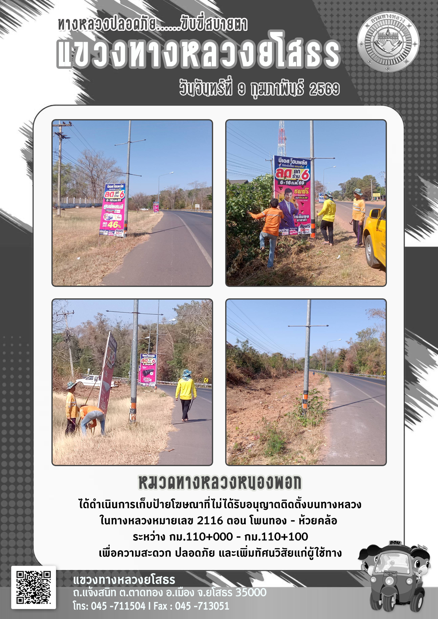 วันจันทร์ที่ 9 กุมภาพันธ์ 2569 หมวดทางหลวงหนองพอก ได้ดำเนินการเก็บป้ายโฆษณาที่ไม่ได้รับอนุญาตติดตั้งบนทางหลวง ในทางหลวงหมายเลข 2116 ตอน โพนทอง - ห้วยคล้อ ระหว่าง กม.110+000 - กม.110+100 เพื่อความสะดวก ปลอดภัย และเพิ่มทัศนวิสัยแก่ผู้ใช้ทาง