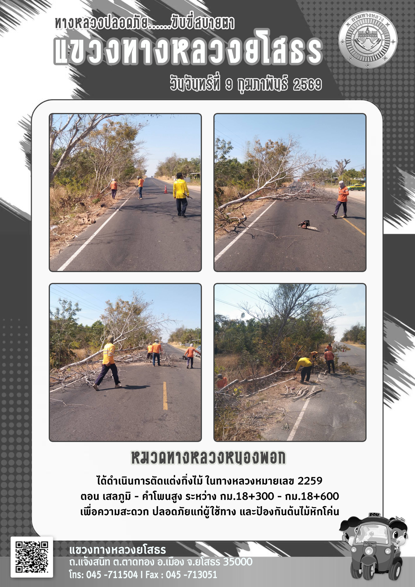 วันจันทร์ที่ 9 กุมภาพันธ์ 2569 หมวดทางหลวงหนองพอก ได้ดำเนินการตัดแต่งกิ่งไม้ ในทางหลวงหมายเลข 2259 ตอน เสลภูมิ - คำโพนสูง ระหว่าง กม.18+300 - กม.18+600 เพื่อความสะดวก ปลอดภัยแก่ผู้ใช้ทาง และปลงกันกันดันไม้หักโค่น