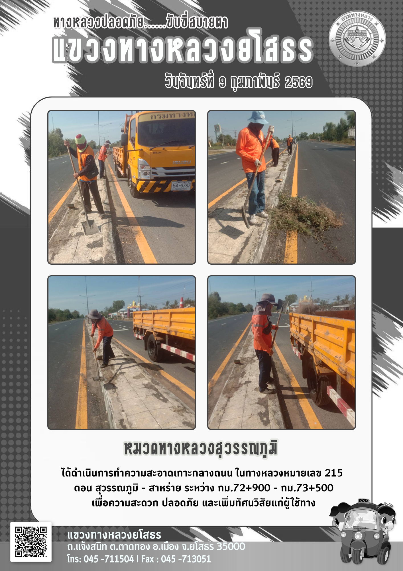 วันจันทร์ที่ 9 กุมภาพันธ์ 2569 หมวดทางหลวงสุวรรณภูมิ ได้ดำเนินการทำความสะอาดเกาะกลางถนน ในทางหลวงหมายเลข 215 ตอน สุวรรณภูมิ - สาหร่าย ระหว่าง กม.72+900 - กม.73+500 เพื่อความสะดวก ปลอดภัย และเพิ่มทัศนวิสัยแก่ผู้ใช้ทาง