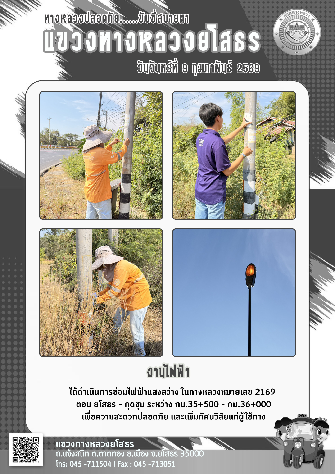 วันจันทร์ที่ 9 กุมภาพันธ์ 2569 งานไฟฟ้า ได้ดำเนินการซ่อมไฟฟ้าแสงสว่าง ในทางหลวงหมายเลข 2169 ตอน ยโสธร - กดชุม ระหว่าง กม.35+500 - กม.36+000 เพื่อความสะดวกปลอดภัย และเพิ่มทัศนวิสัยแก่ผู้ใช้ทาง
