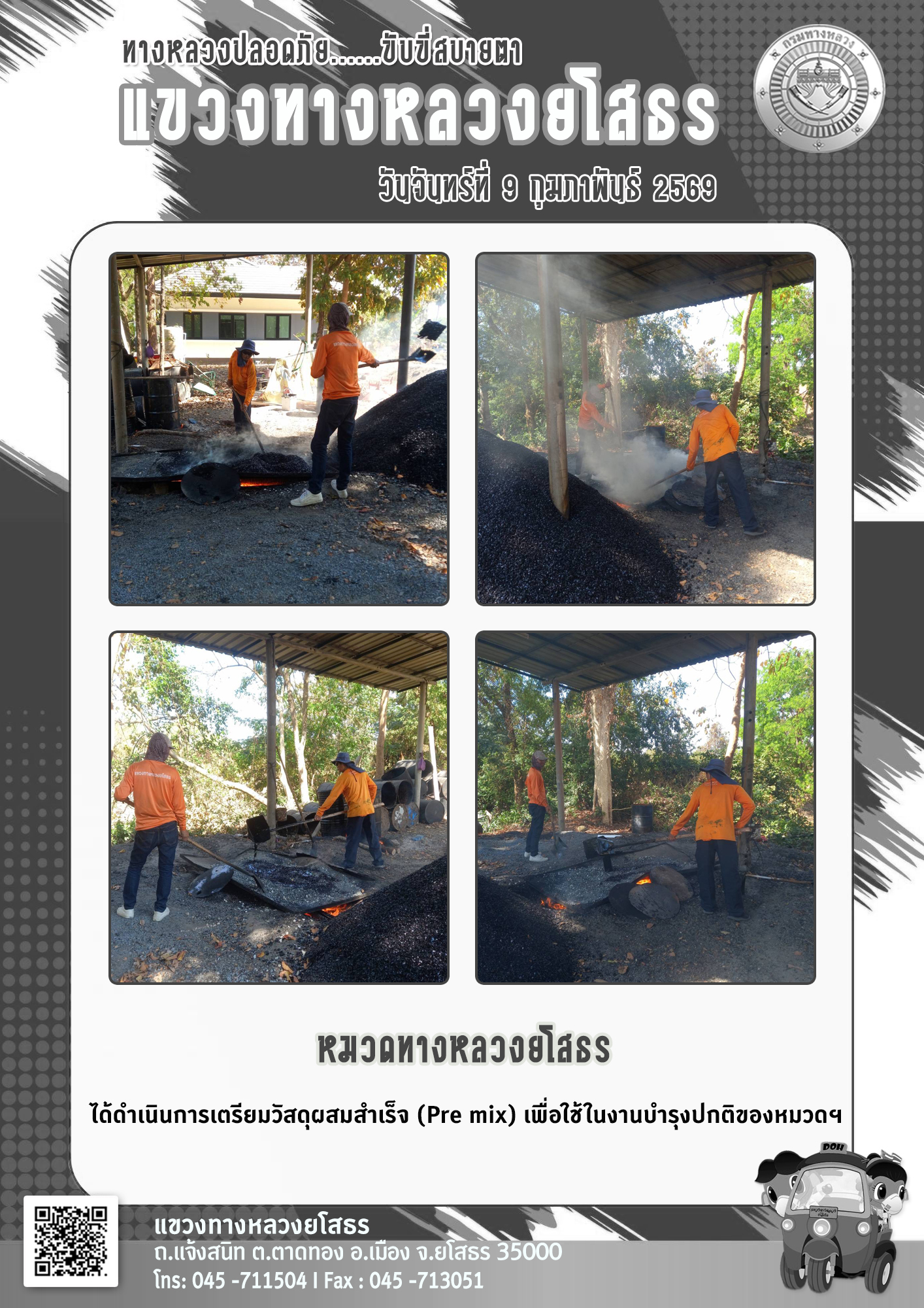 วันจันทร์ที่ 9 กุมภาพันธ์ 2569 หมวดทางหลวงยโสธร ได้ดำเนินการเตรียมวัสดุผสมสำเร็จ (Pre mix) เพื่อใช้ในงานบำรุงปกติของหมวดฯ