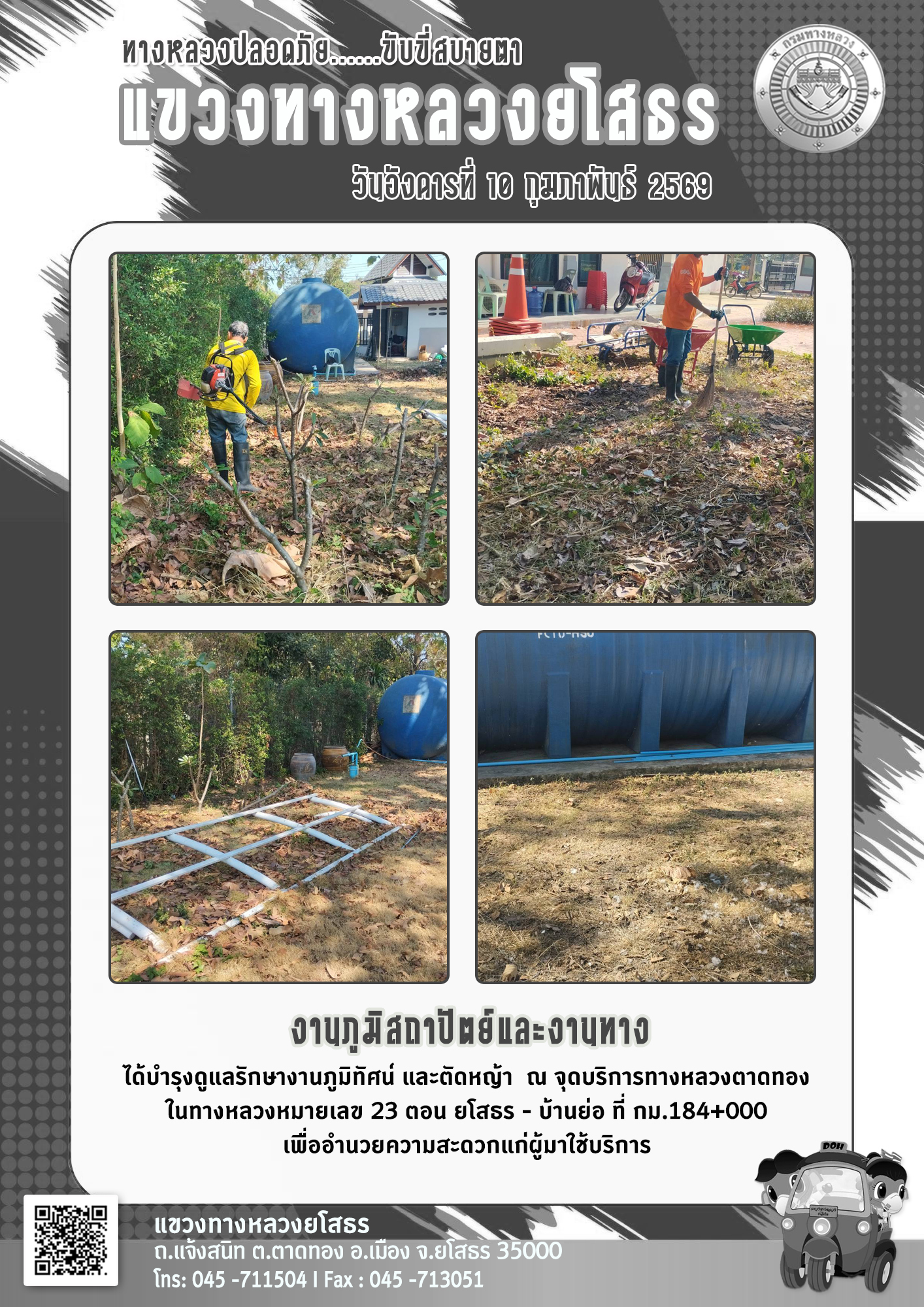 วันอังคารที่ 10 กุมภาพันธ์ 2569 งานภูมิสถาปัตย์และงานทาง ได้บำรุงดูแลรักษางานภูมิทัศน์ และตัดหญ้า ณ จุดบริการทางหลวงตาดทอง ในทางหลวงหมายเลข 23 ตอน ยโสธร - บ้านย่อ ที่ กม.184+000 เพื่ออำนวยความสะดวกแก่ผู้มาใช้บริการ