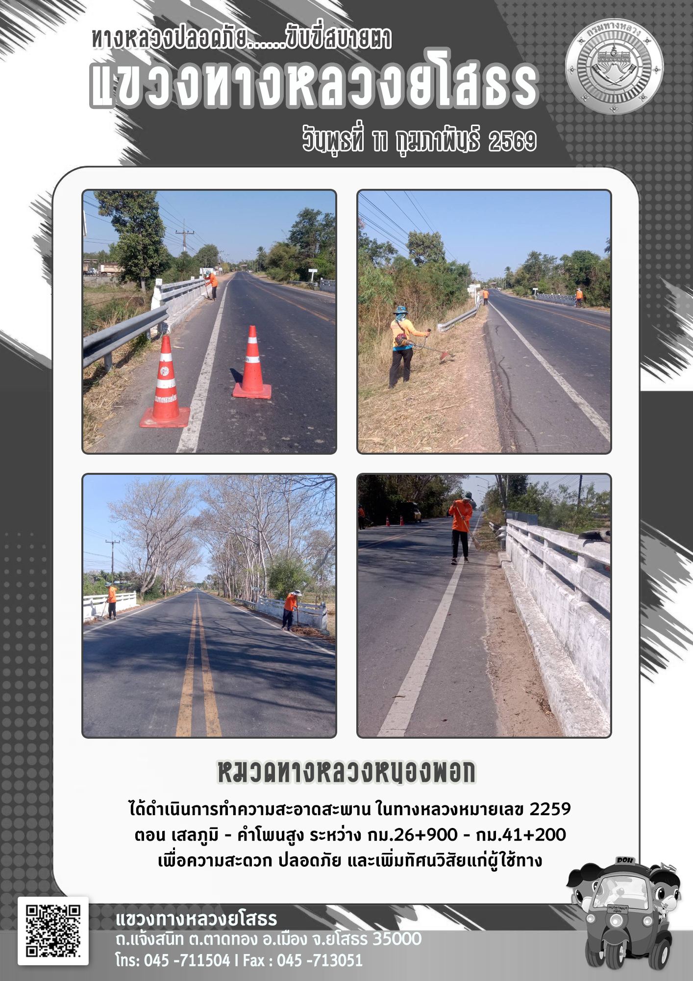 วันพุธที่ 11 กุมภาพันธ์ 2569 หมวดทางหลวงหนองพอก ได้ดำเนินการทำความสะอาดสะพาน ในทางหลวงหมายเลข 2259 ตอน เสลภูมิ - คำโพนสูง ระหว่าง กม.26+900 - กม.41+200 เพื่อความสะดวก ปลอดภัย และเพิ่มทัศนวิสัยแก่ผู้ใช้ทาง