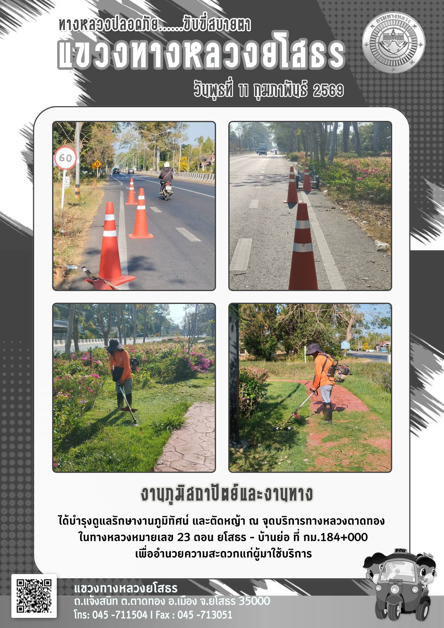 วันพุธที่ 11 กุมภาพันธ์ 2569 งานภูมิสถาปัตย์และงานทาง ได้บำรงดูแลรักษางานภูมิทัศน์ และตัดหญ้า ณ จุดบริการทางหลวงตาดทอง ในทางหลวงหมายเลข 23 ตอน ยโสธร - บ้านย่อ ที่ กม.184+000 เพื่ออำนวยความสะดวกแก่ผู้มาใช้บริการ