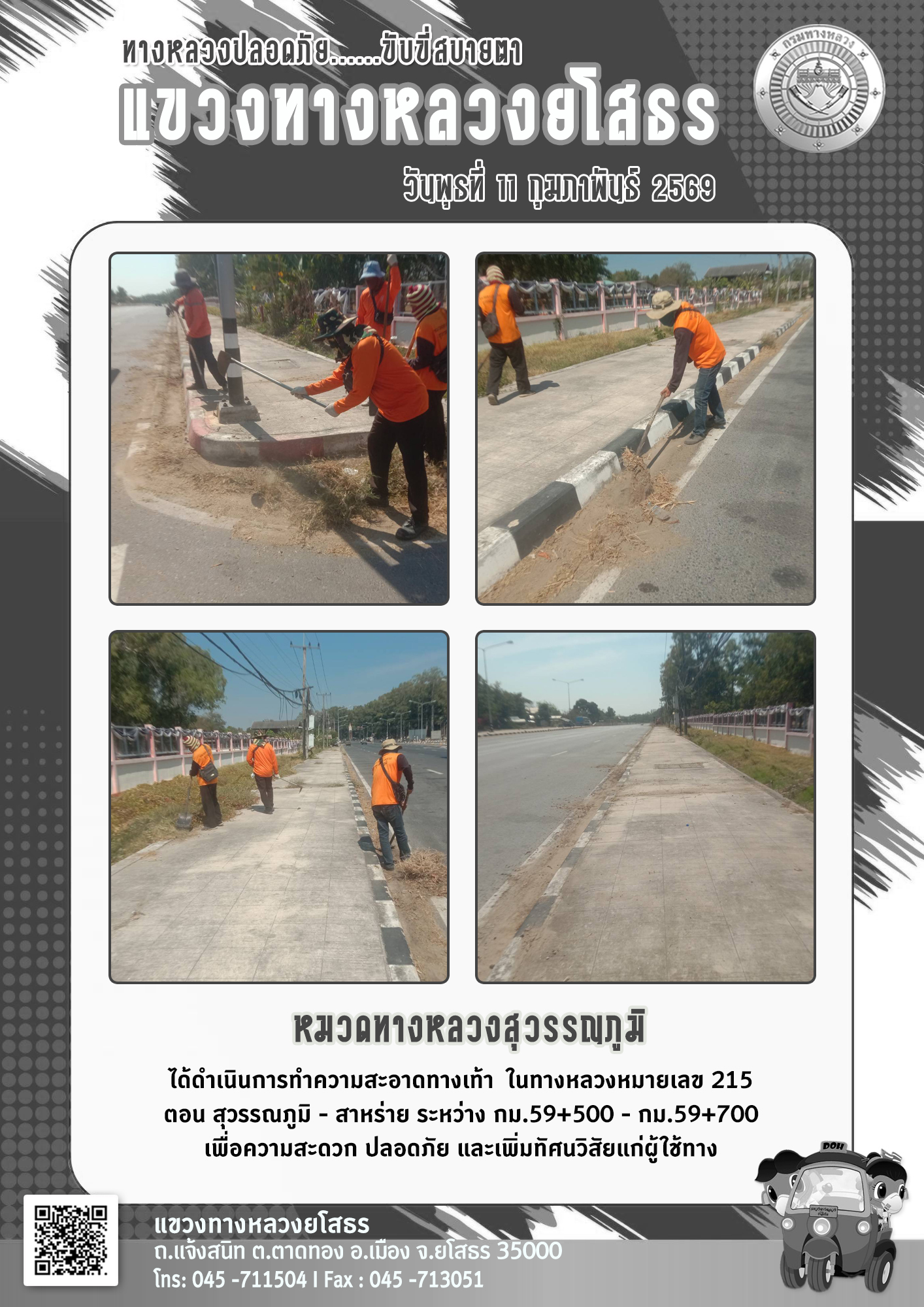 วันพุธที่ 11 กุมภาพันธ์ 2569 หมวดทางหลวงสุวรรณภูมิ ได้ดำเนินการทำความสะอาดทางเท้า ในทางหลวงหมายเลข 215 ตอน สุวรรณภูมิ - สาหร่าย ระหว่าง กม.59+500 - กม.59+700 เพื่อความสะดวก ปลอดภัย และเพิ่มทัศนวิสัยแก่ผู้ใช้ทาง