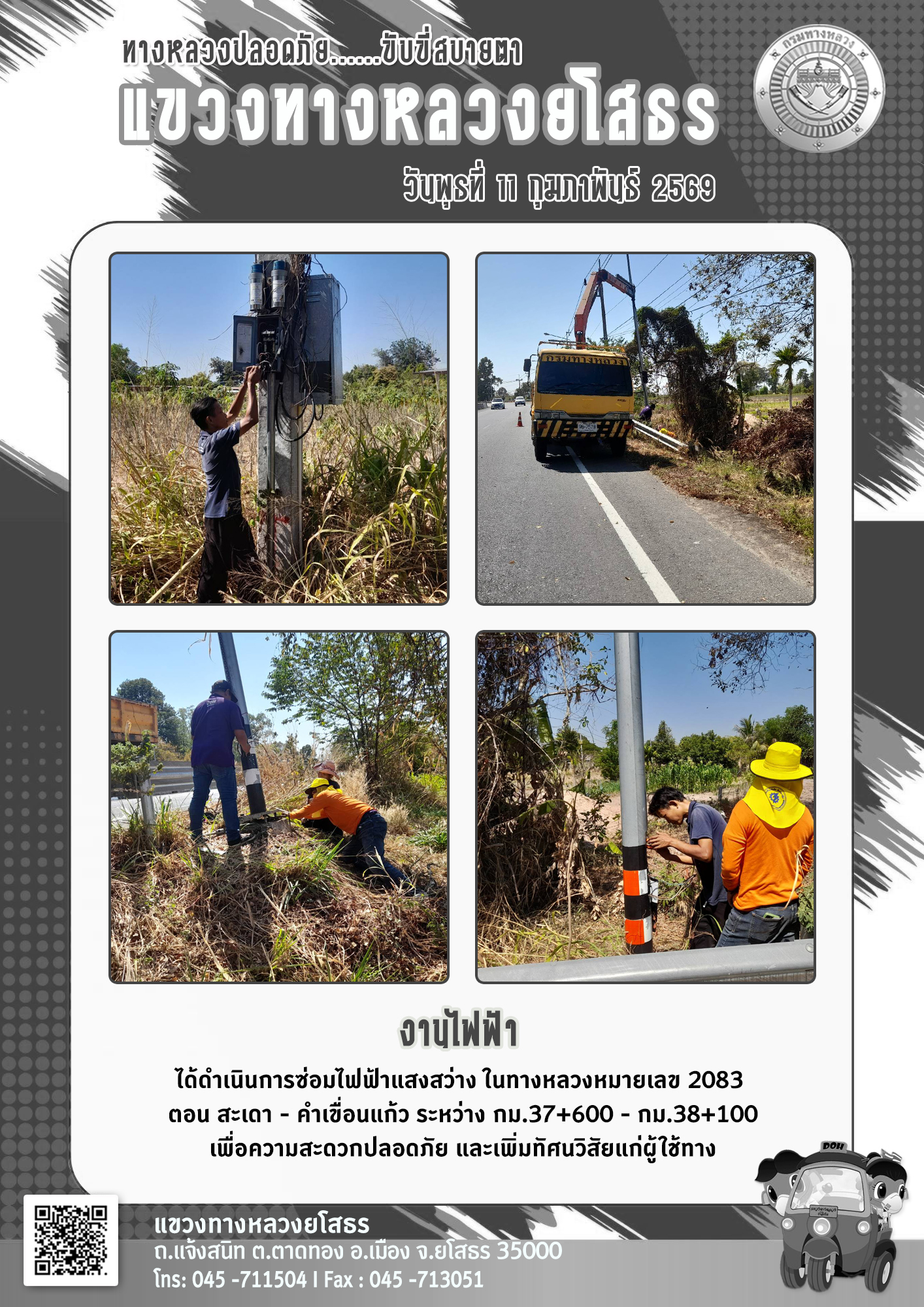 วันพุธที่ 11 กุมภาพันธ์ 2569 งานไฟฟ้า ได้ดำเนินการซ่อมไฟฟ้าแสงสว่าง ในทางหลวงหมายเลข 2083 ตอน สะเดา - คำเขื่อนแก้ว ระหว่าง กม.37+600 - กม.38+100 เพื่อความสะดวกปลอดภัย และเพิ่มทัศนวิสัยแก่ผู้ใช้ทาง