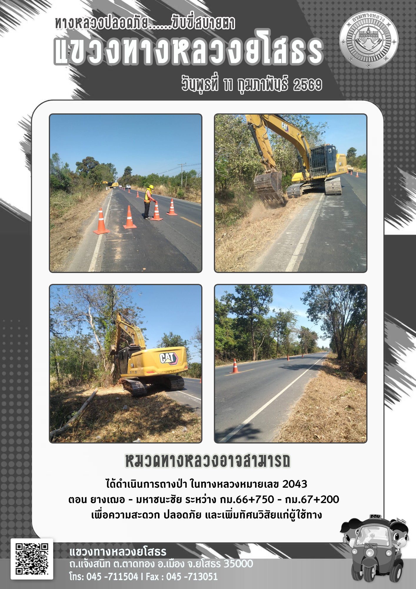 วันพุธที่ 11 กุมภาพันธ์ 2569 หมวดทางหลวงอาจสามารถ ได้ดำเนินการถางป่า ในทางหลวงหมายเลข 2043 ตอน ยางเฌอ - มหาชนะชัย ระหว่าง กม.66+750 - กม.67+200 เพื่อความสะดวก ปลอดภัย และเพิ่มทัศนวิสัยแก่ผู้ใช้ทาง