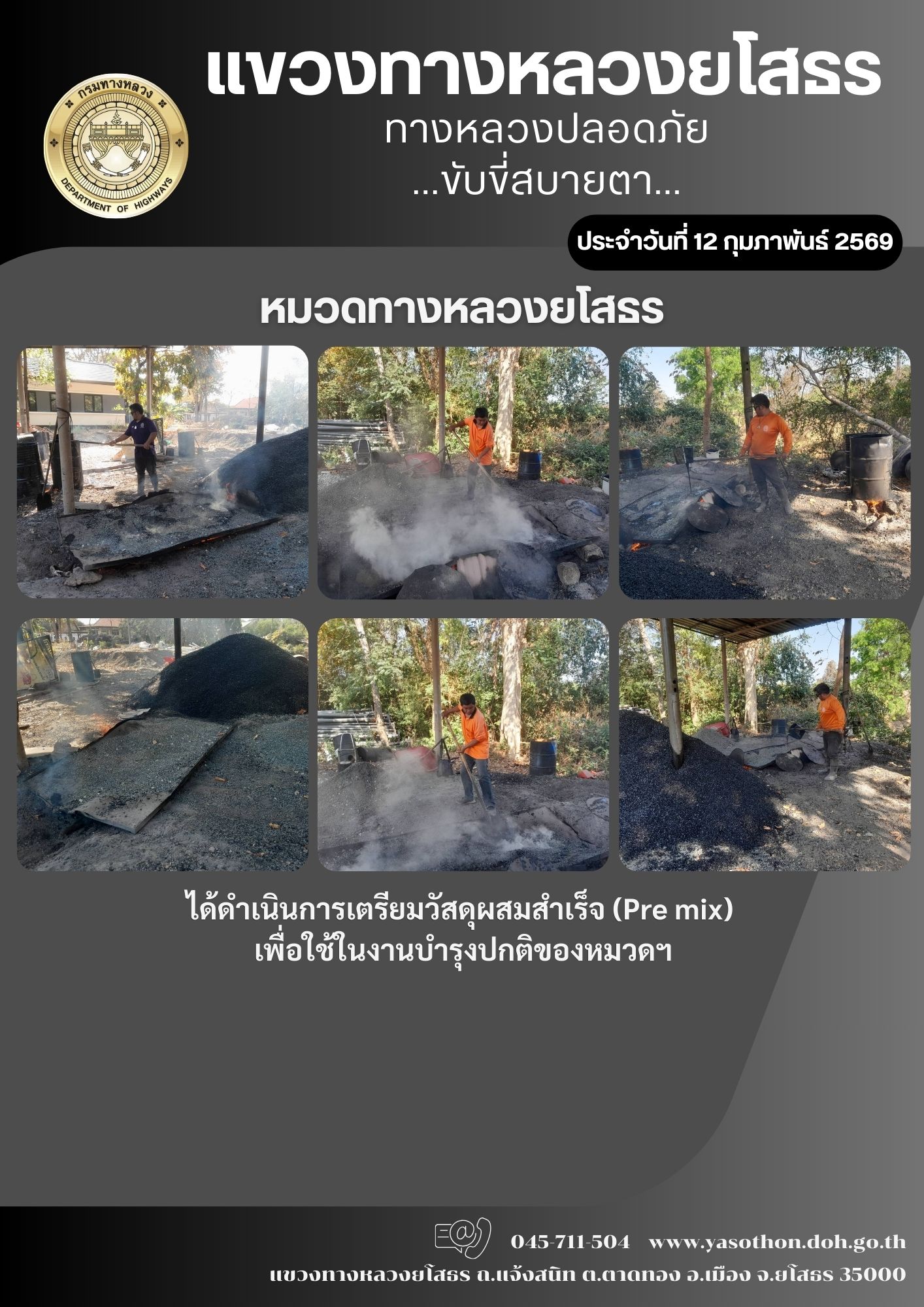 วันที่ 12 กุมภาพันธ์ 2569 หมวดทางหลวงยโสธร ได้ดำเนินการเตรียมวัสดุผสมสำเร็จ (Pre mix) เพื่อใช้ในงานบำรุงปกติของหมวดฯ