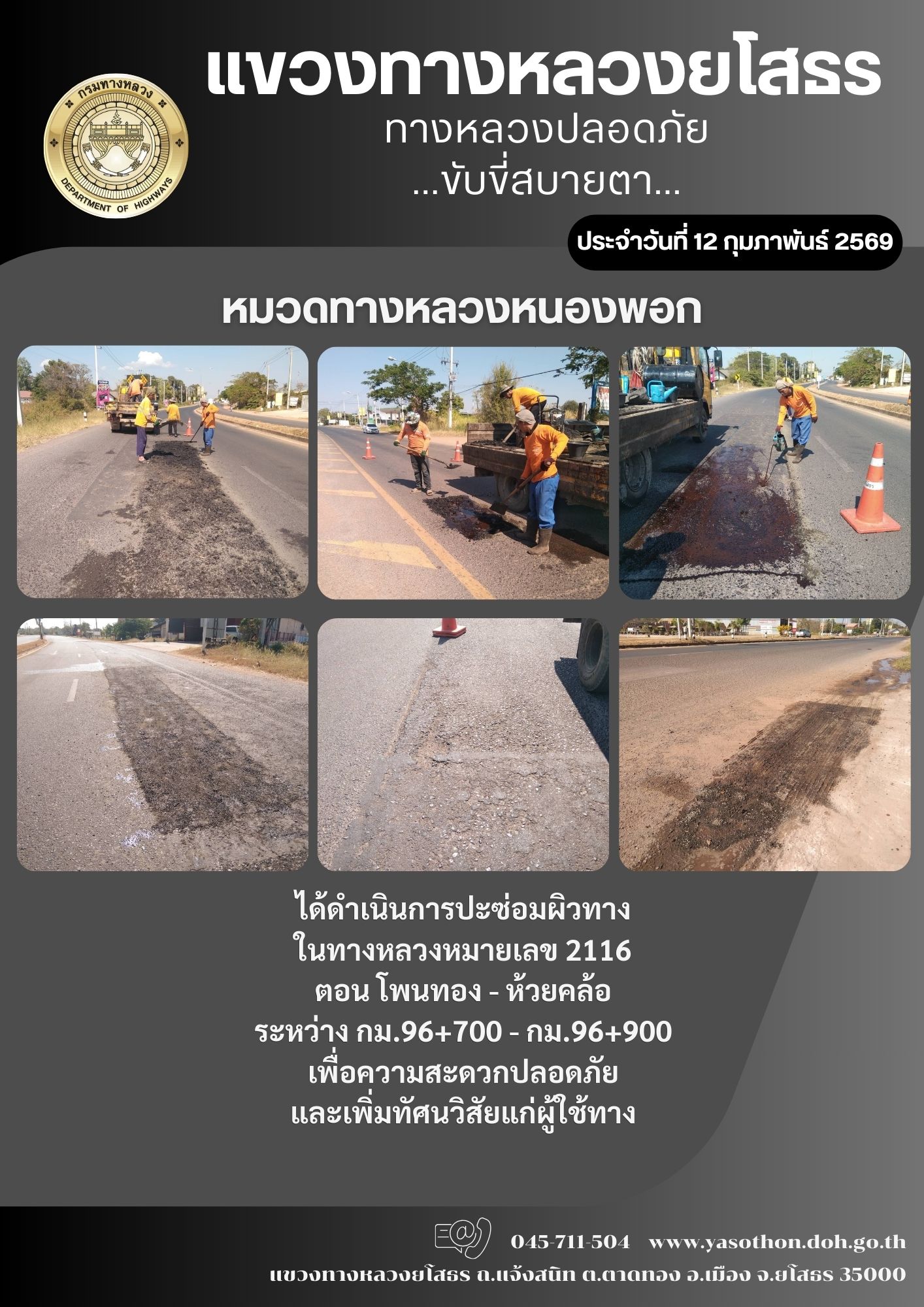 วันที่ 12 กุมภาพันธ์ 2569 หมวดทางหลวงหนองพอก ได้ดำเนินการปะซ่อมผิวทาง ในทางหลวงหมายเลข 2116 ตอน โพนทอง - ห้วยคล้อ ระหว่าง กม.96+700 - กม.96+900 เพื่อความสะดวกปลอดภัย และเพิ่มทัศนวิสัยแก่ผู้ใช้ทาง