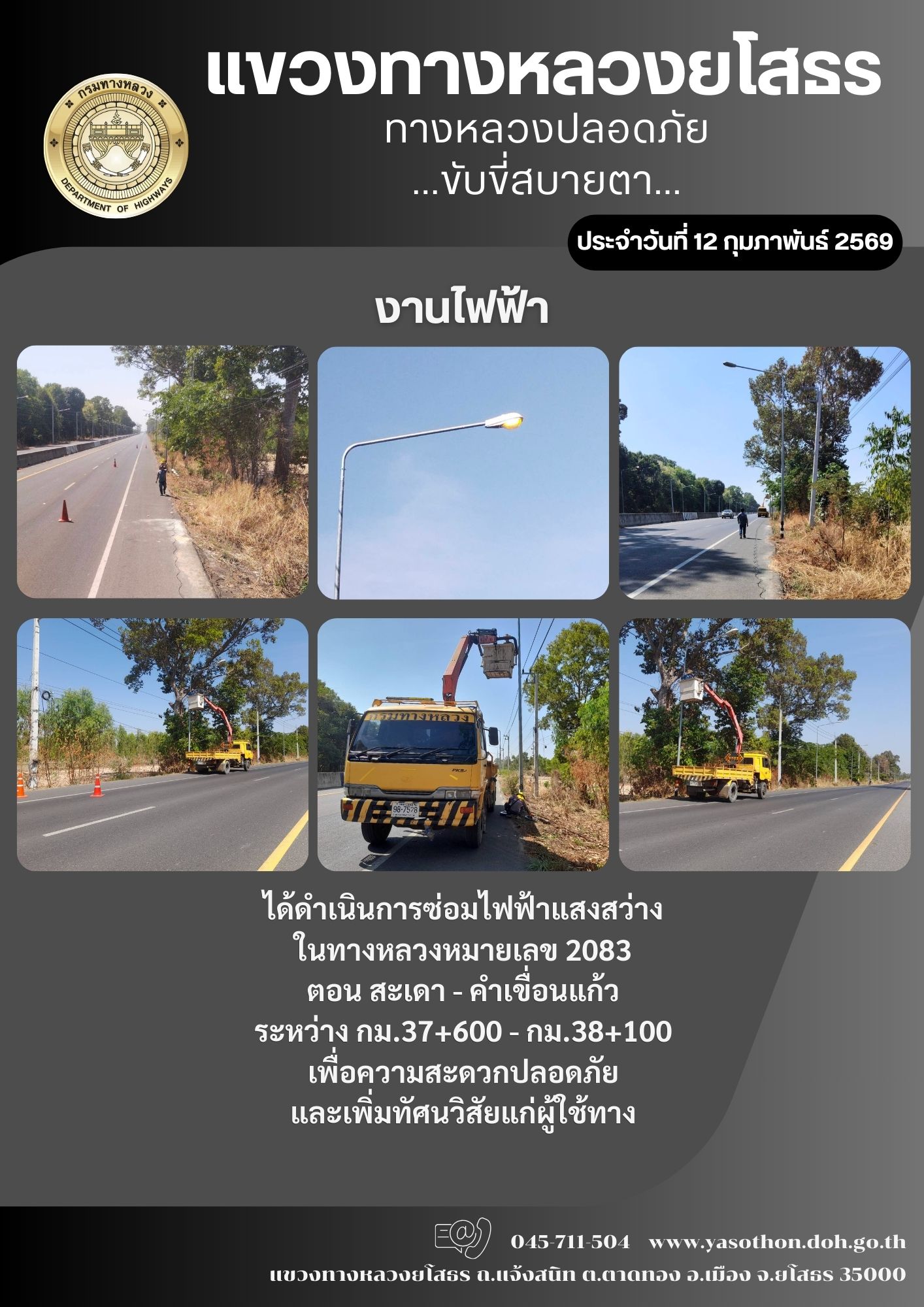 วันที่ 12 กุมภาพันธ์ 2569 งานไฟฟ้า ได้ดำเนินการซ่อมไฟฟ้าแสงสว่าง ในทางหลวงหมายเลข 2083 ตอน สะเดา - คำเขื่อนแก้ว ระหว่าง กม.37+600 - กม.38+100 เพื่อความสะดวกปลอดภัย และเพิ่มทัศนวิสัยแก่ผู้ใช้ทาง