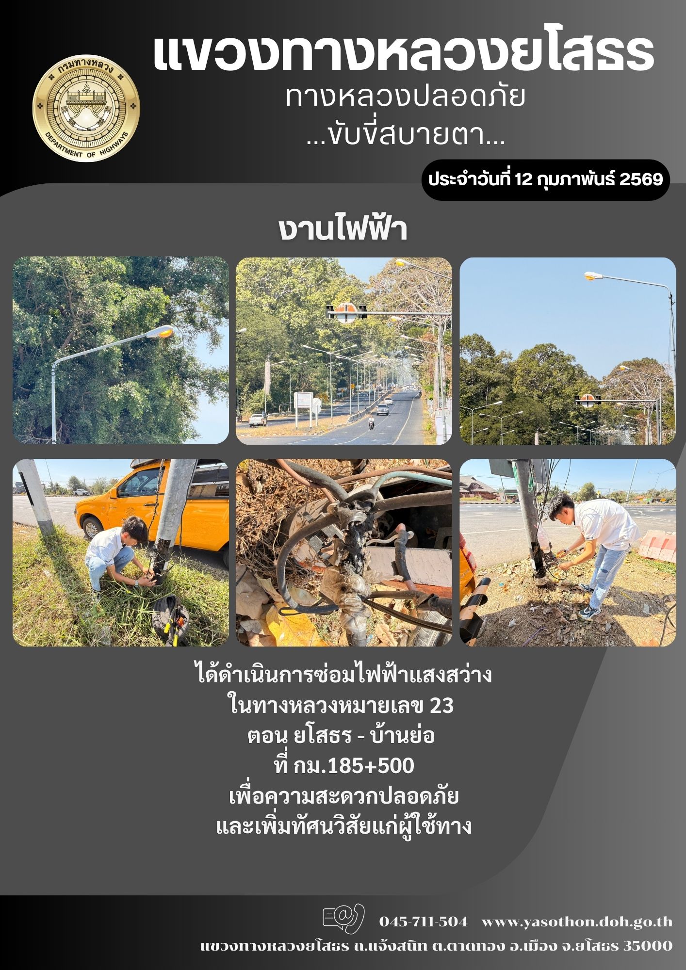 วันที่ 12 กุมภาพันธ์ 2569 งานไฟฟ้า ได้ดำเนินการซ่อมไฟฟ้าแสงสว่าง ในทางหลวงหมายเลข 23 ตอน ยโสธร - บ้านย่อ ที่ กม.185+500 เพื่อความสะดวกปลอดภัย และเพิ่มทัศนวิสัยแก่ผู้ใช้ทาง