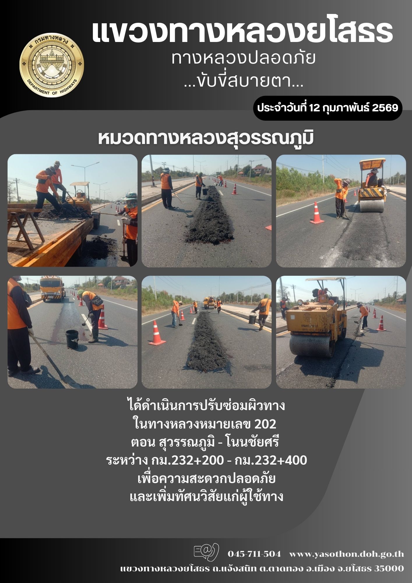 วันที่ 12 กุมภาพันธ์ 2569 หมวดทางหลวงสุวรรณภูมิ ได้ดำเนินการปรับซ่อมผิวทาง ในทางหลวงหมายเลข 202 ตอน สุวรรณภูมิ - โนนชัยศรี ระหว่าง กม.232+200 - กม.232+400 เพื่อความสะดวกปลอดภัย และเพิ่มทัศนวิสัยแก่ผู้ใช้ทาง