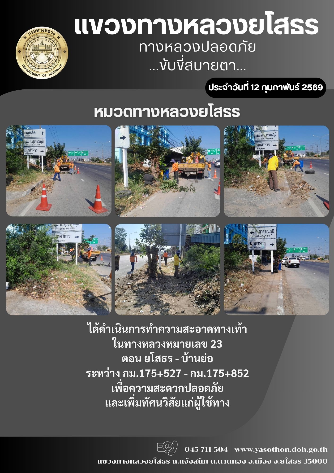 วันที่ 12 กุมภาพันธ์ 2569 หมวดทางหลวงยโสธร ได้ดำเนินการทำความสะอาดทางเท้า ในทางหลวงหมายเลข 23 ตอน ยโสธร - บ้านย่อ ระหว่าง กม.175+527 - กม.175+852 เพื่อความสะดวกปลอดภัย และเพิ่มทัศนวิสัยแก่ผู้ใช้ทาง