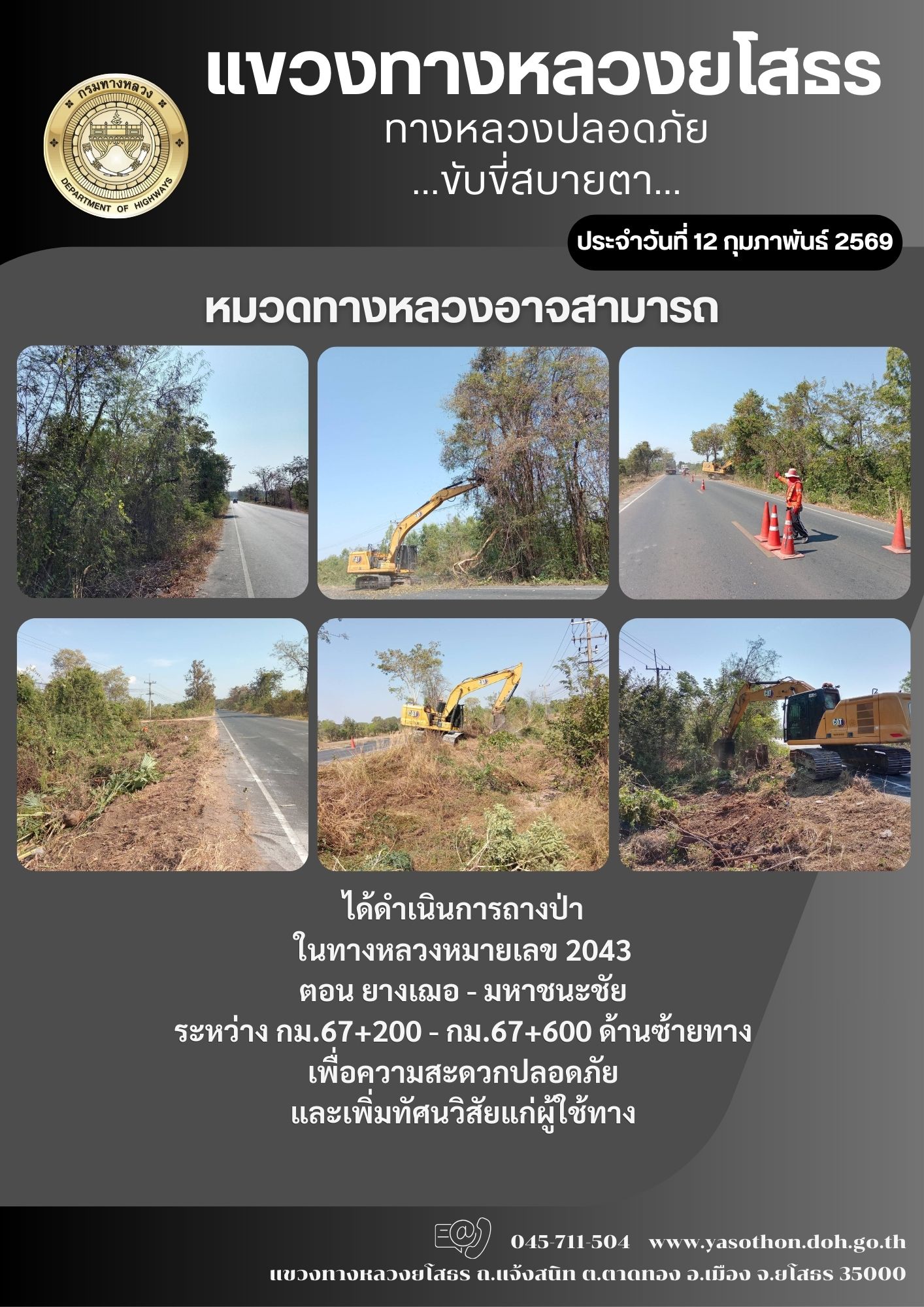 วันที่ 12 กุมภาพันธ์ 2569 หมวดทางหลวงอาจสามารถ ได้ดำเนินการถางป่า ในทางหลวงหมายเลข 2043 ตอน ยางเฌอ - มหาชนะชัย ระหว่าง กม.67+200 - กม.67+600 ด้านซ้ายทาง เพื่อความสะดวกปลอดภัย และเพิ่มทัศนวิสัยแก่ผู้ใช้ทาง