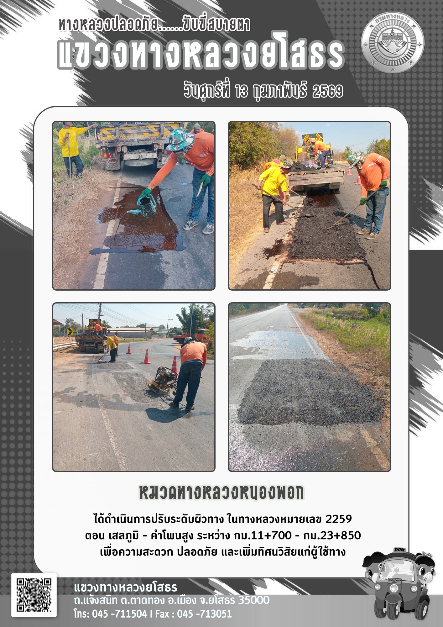 วันศุกร์ที่ 13 กุมภาพันธ์ 2569 หมวดทางหลวงหนองพอก ได้ดำเนินการปรับระดับผิวทาง ในทางหลวงหมายเลข 2259 ตอน เสลภูมิ - คำโพนสูง ระหว่าง กม.11+700 - กม.23+850 เพื่อความสะดวก ปลอดภัย และเพิ่มทัศนวิสัยแก่ผู้ใช้ทาง