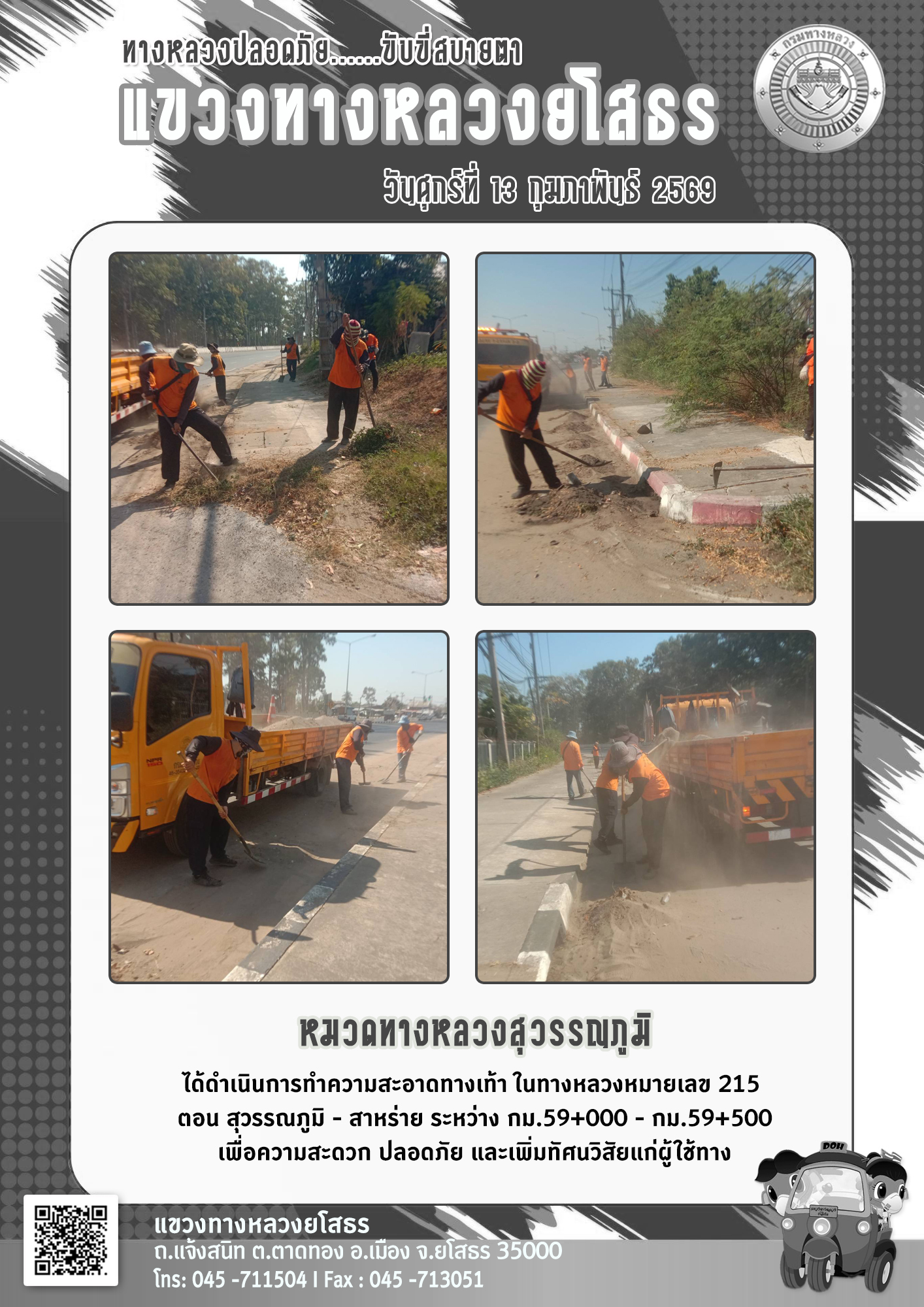 วันศุกร์ที่ 13 กุมภาพันธ์ 2569 หมวดทางหลวงสุวรรณภูมิ ได้ดำเนินการทำความสะอาดทางเท้า ในทางหลวงหมายเลข 215 ตอน สุวรรณภูมิ - สาหร่าย ระหว่าง กม.59+000 - กม.59+500 เพื่อความสะดวก ปลอดภัย และเพิ่มทัศนวิสัยแก่ผู้ใช้ทาง