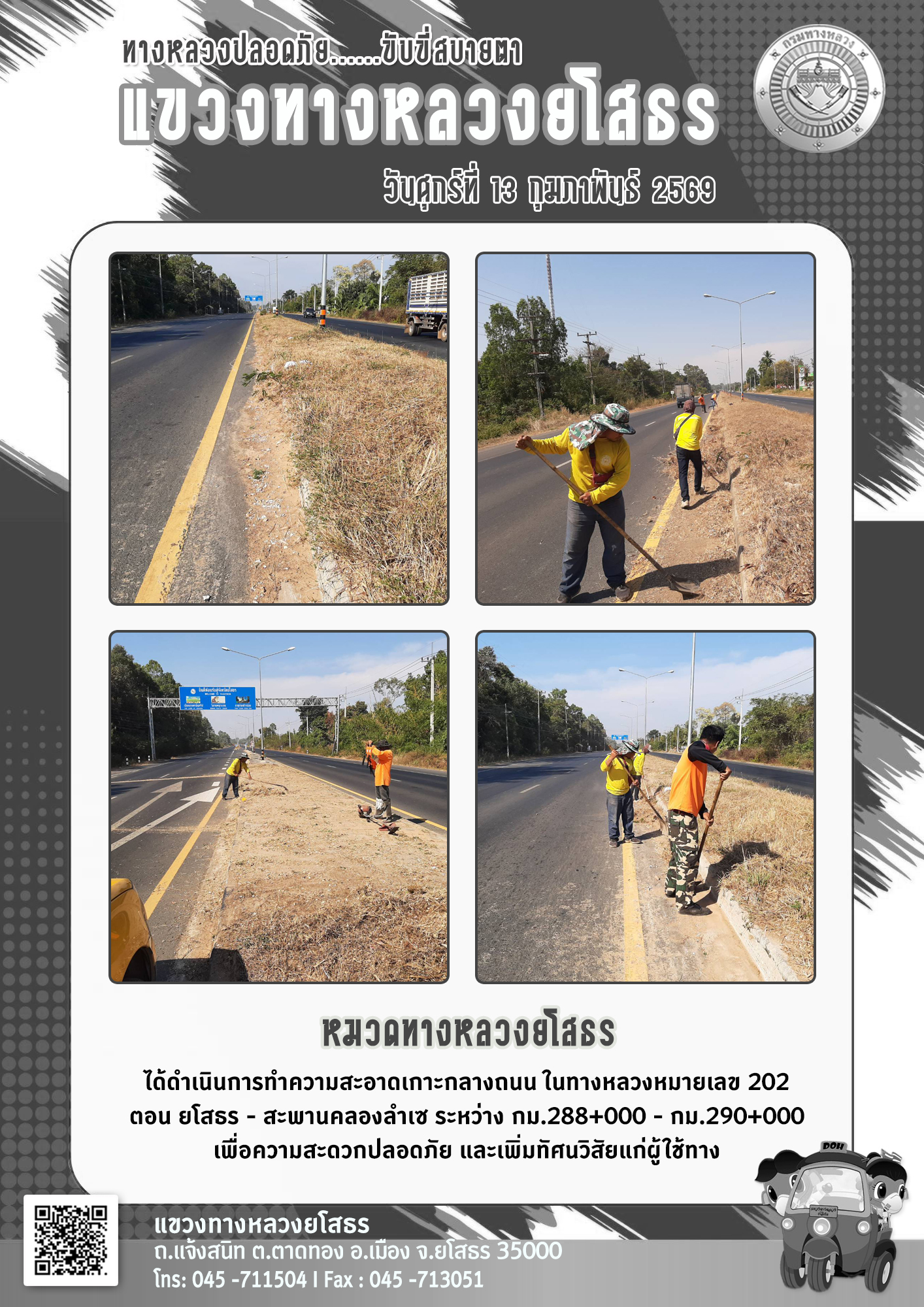 วันศุกร์ที่ 13 กุมภาพันธ์ 2569 หมวดทางหลวงยโสธร ได้ดำเนินการทำความสะอาดเกาะกลางถนน ในทางหลวงหมายเลข 202 ตอน ยโสธร - สะพานคลองลำเซ ระหว่าง กม.288+000 - กม.290+000 เพื่อความสะดวกปลอดภัย และเพิ่มทัศนวิสัยแก่ผู้ใช้ทาง