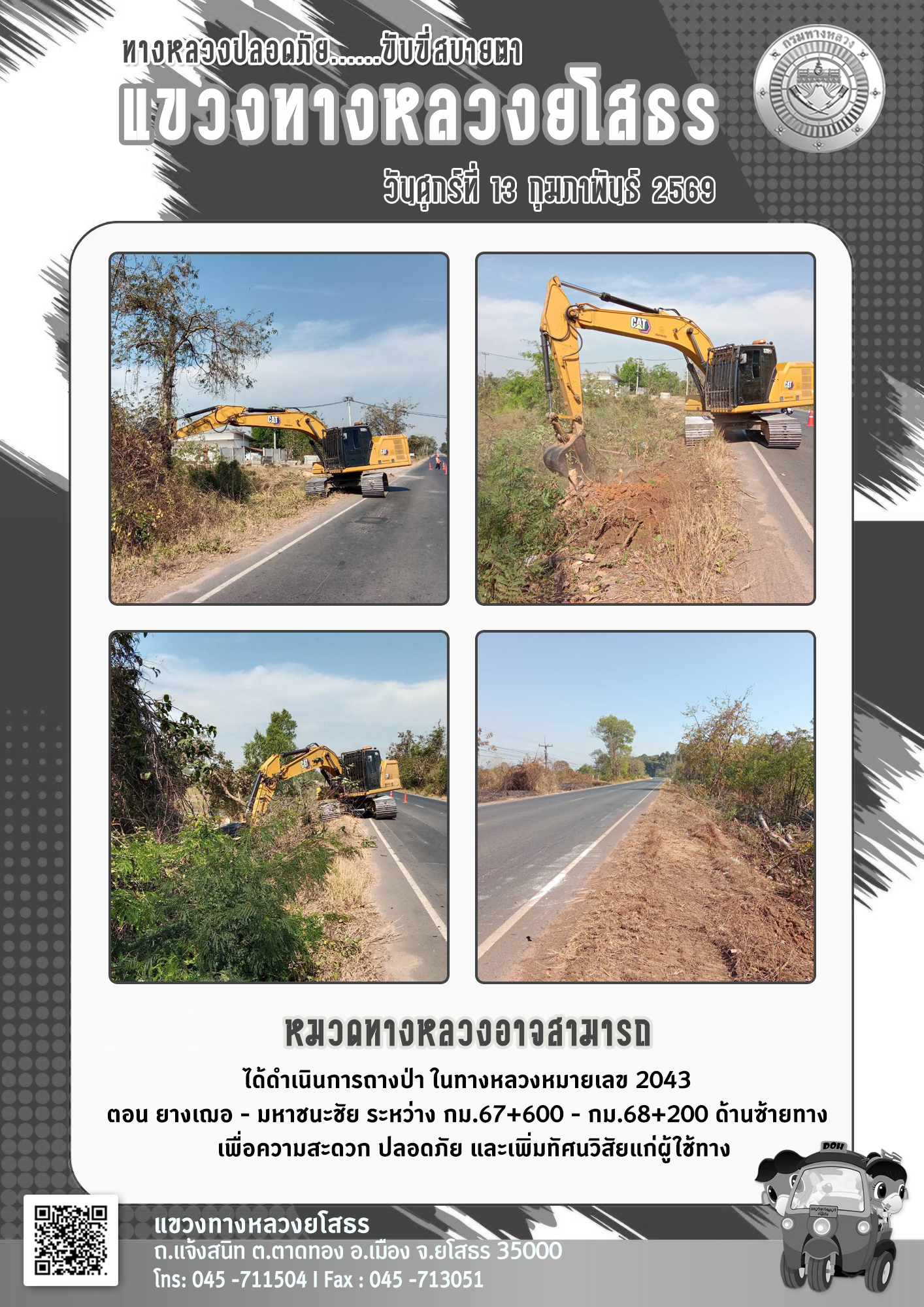 วันศุกร์ที่ 13 กุมภาพันธ์ 2569 หมวดทางหลวงอาจสามารถ ได้ดำเนินการถางป่า ในทางหลวงหมายเลข 2043 ตอน ยางเฌอ - มหาชนะชัย ระหว่าง กม.67+600 - กม.68+200 ด้านซ้ายทาง เพื่อความสะดวก ปลอดภัย และเพิ่มทัศนวิสัยแก่ผู้ใช้ทาง